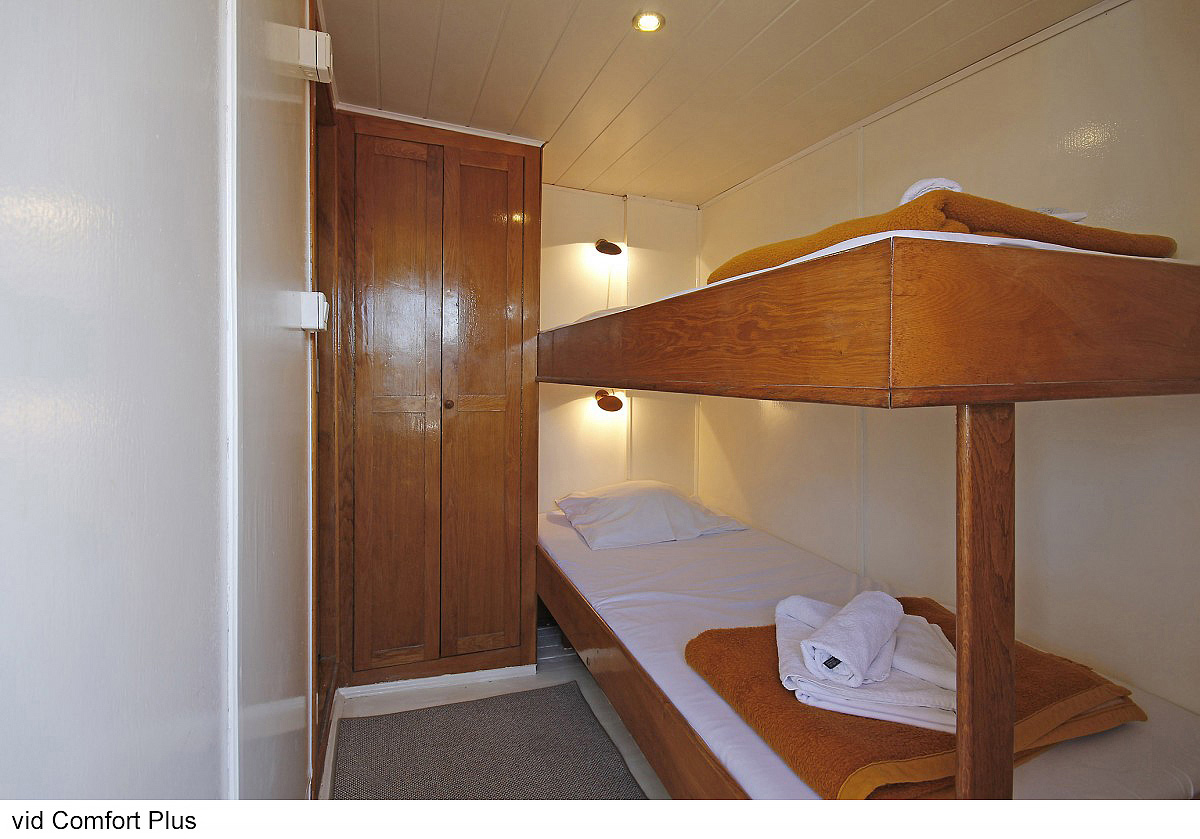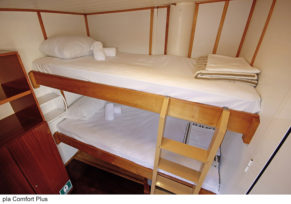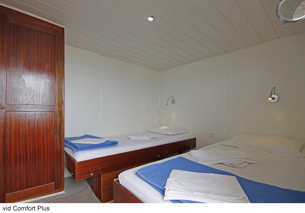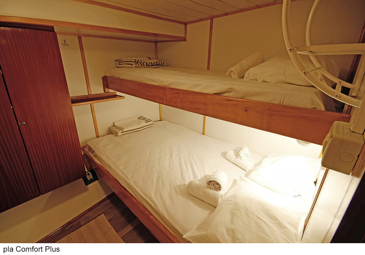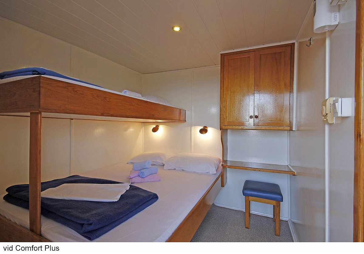 Comfort plus 2 - kajuta s poschodovou posteľou alebo francúzskym lôžkom, vlastné sociálne zariadenie so sprchou a WC, popis platí i pre Comfort plus 1