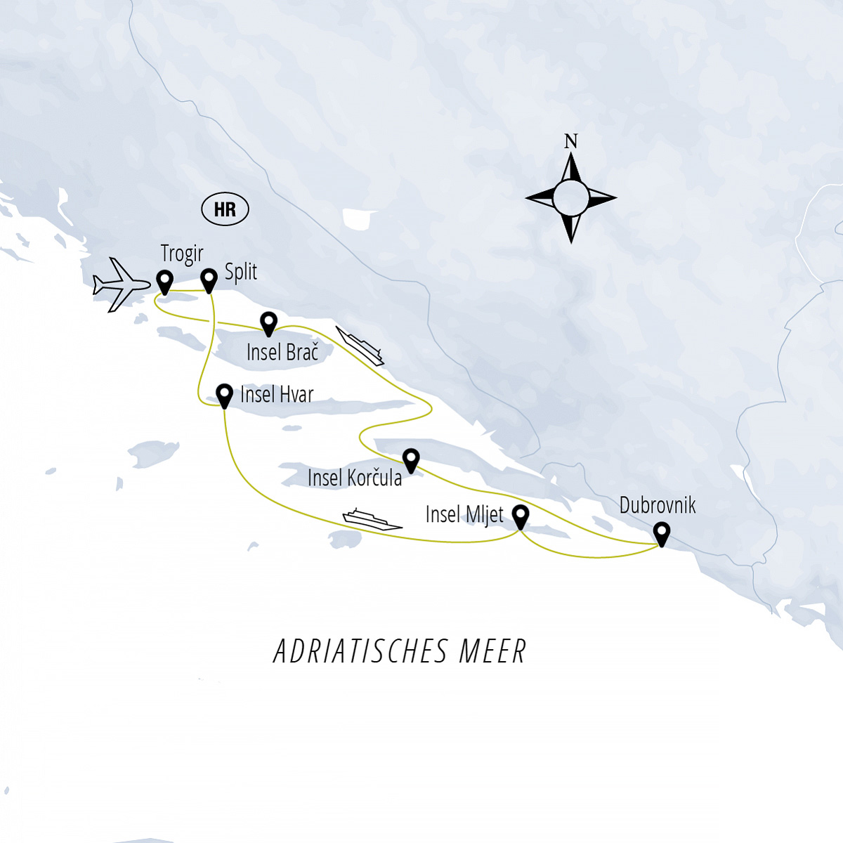 Poznámka: od roku 2025 prejde mólo v Splitskom prístave kompletnou rekonštrukciou, čím sa zníži počet dostupných kotvísk. Vo výnimočných prípadoch to môže viesť k tomu, že Split nebude zaradený a miesto toho budú použité alternatívne zastávky ako Omiš, Milna (ostrov Brač) alebo Rogač (ostrov Šolta).