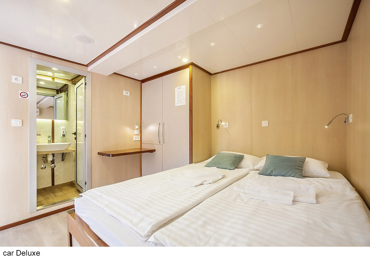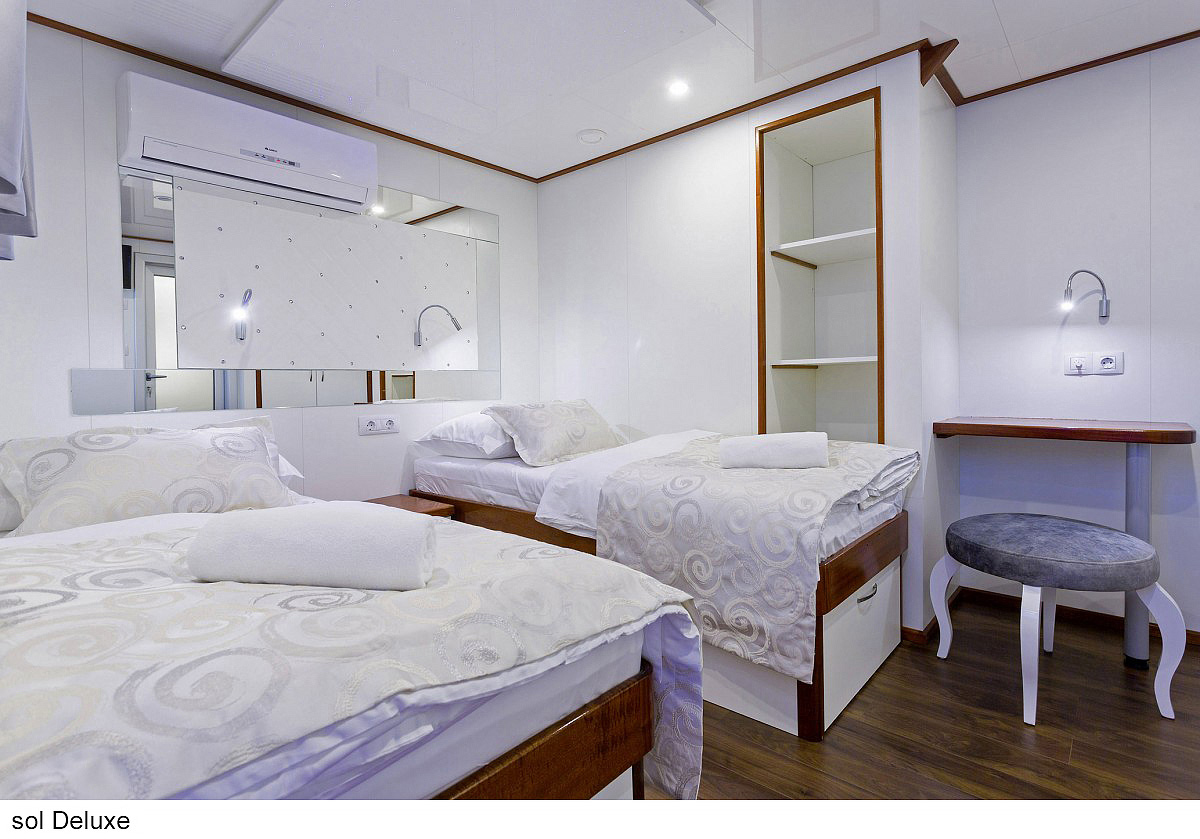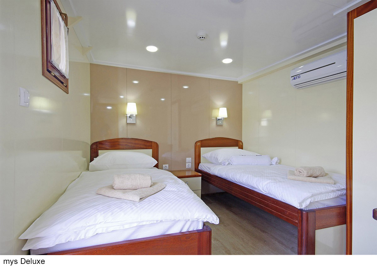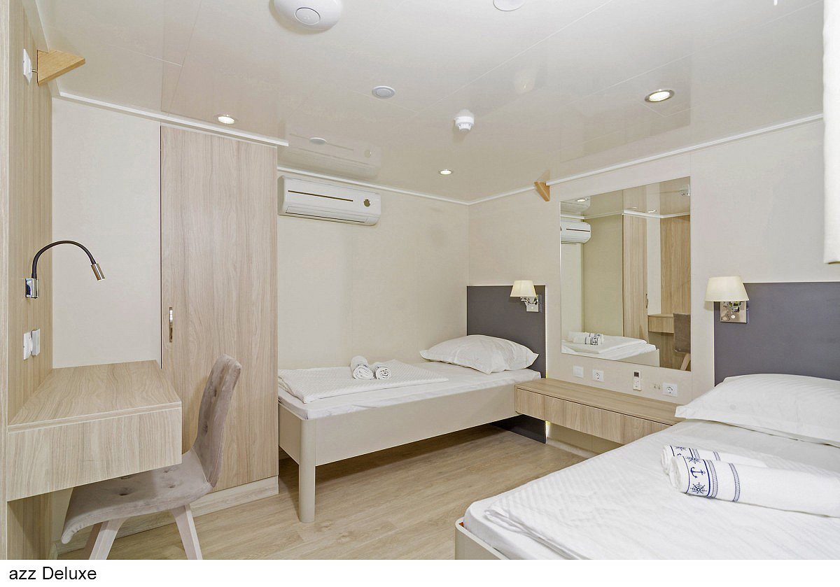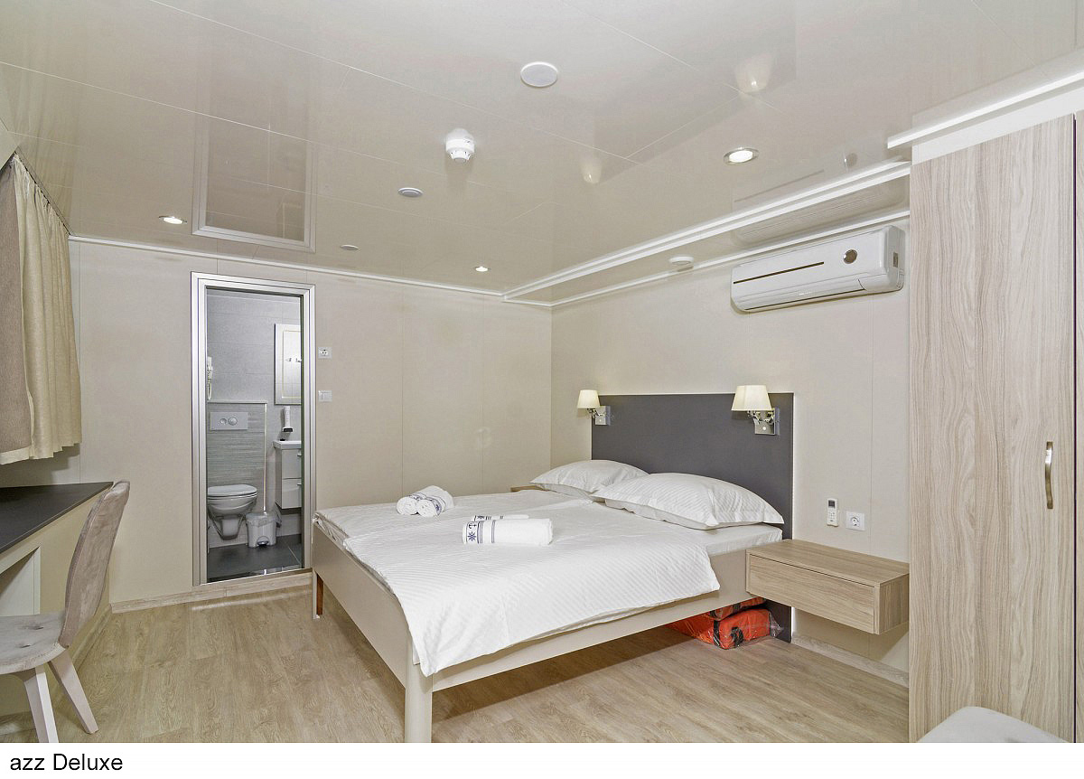 kajuta s dvomi oddelenými lôžkami alebo manželskou posteľou, vlastné sociálne zariadenie so sprchou a WC, popis platný i pre Deluxe 1