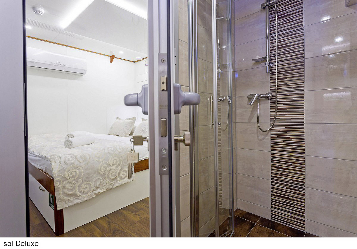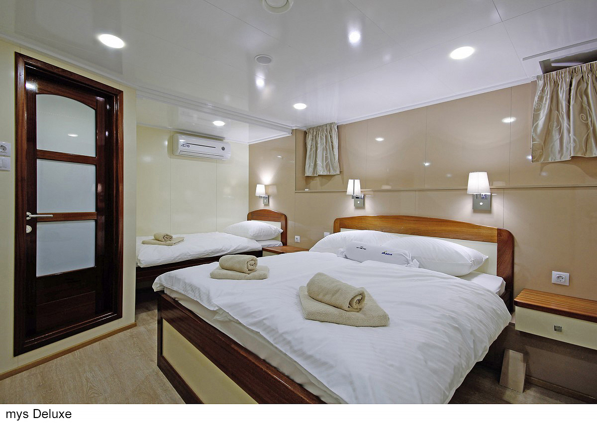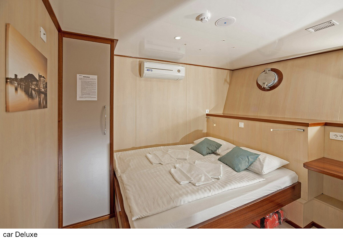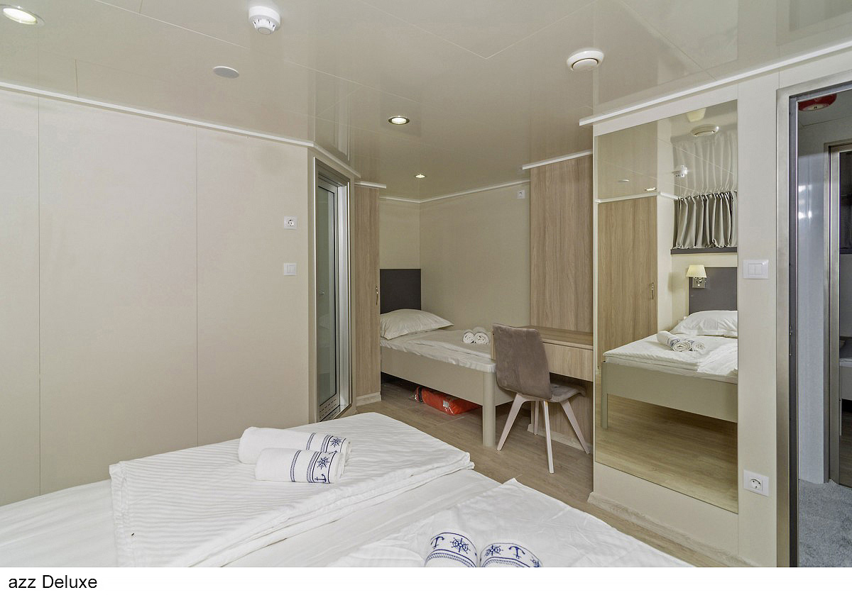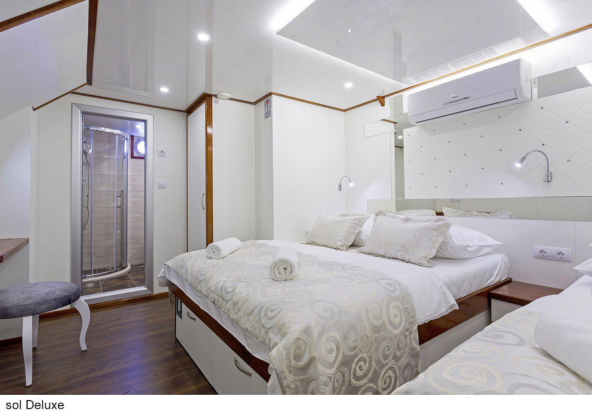 kajuta s dvomi oddelenými lôžkami alebo manželskou posteľou, vlastné sociálne zariadenie so sprchou a WC, popis platný i pre Deluxe 1