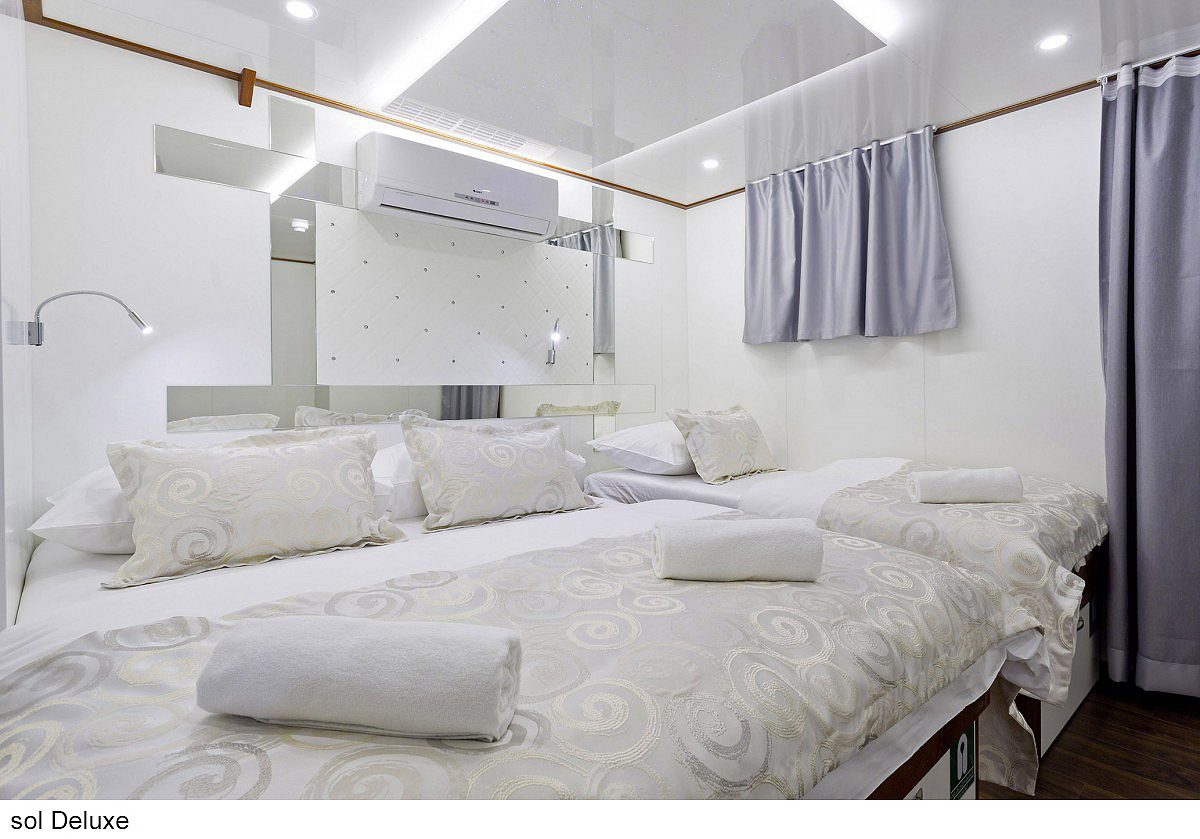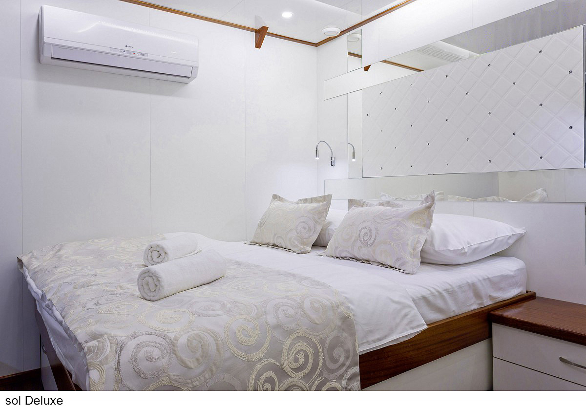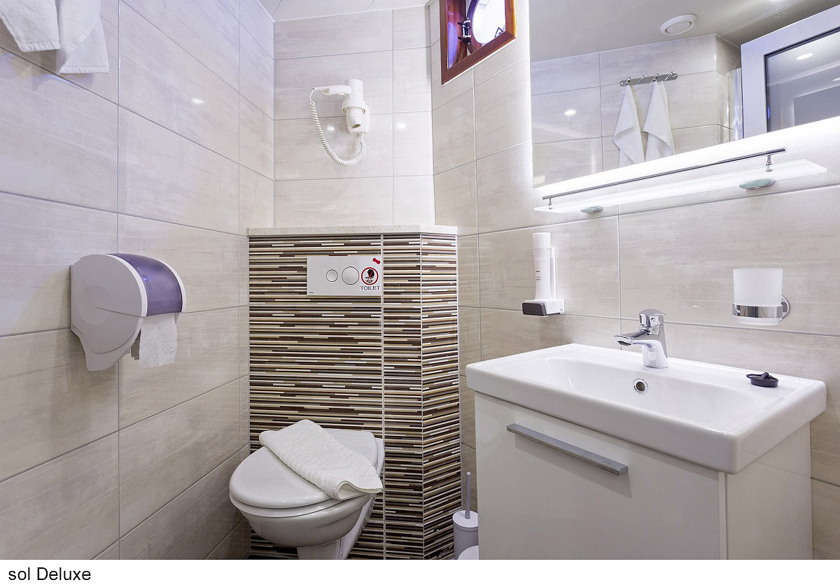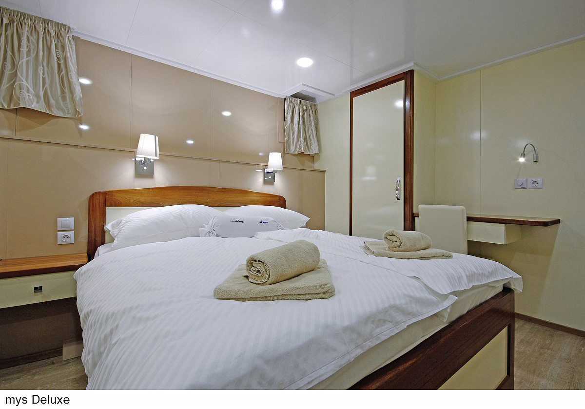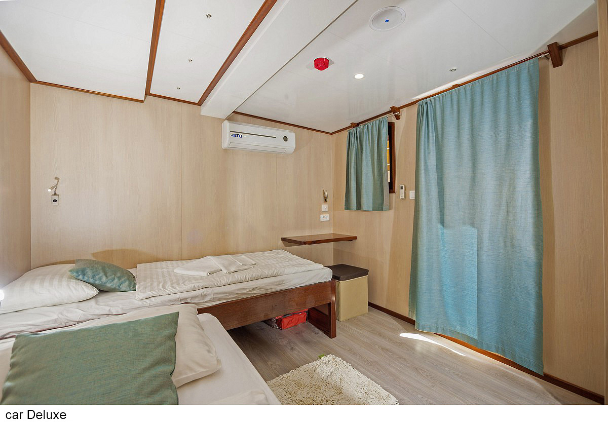 kajuta s dvomi oddelenými lôžkami alebo manželskou posteľou, vlastné sociálne zariadenie so sprchou a WC, popis platný i pre Deluxe 1