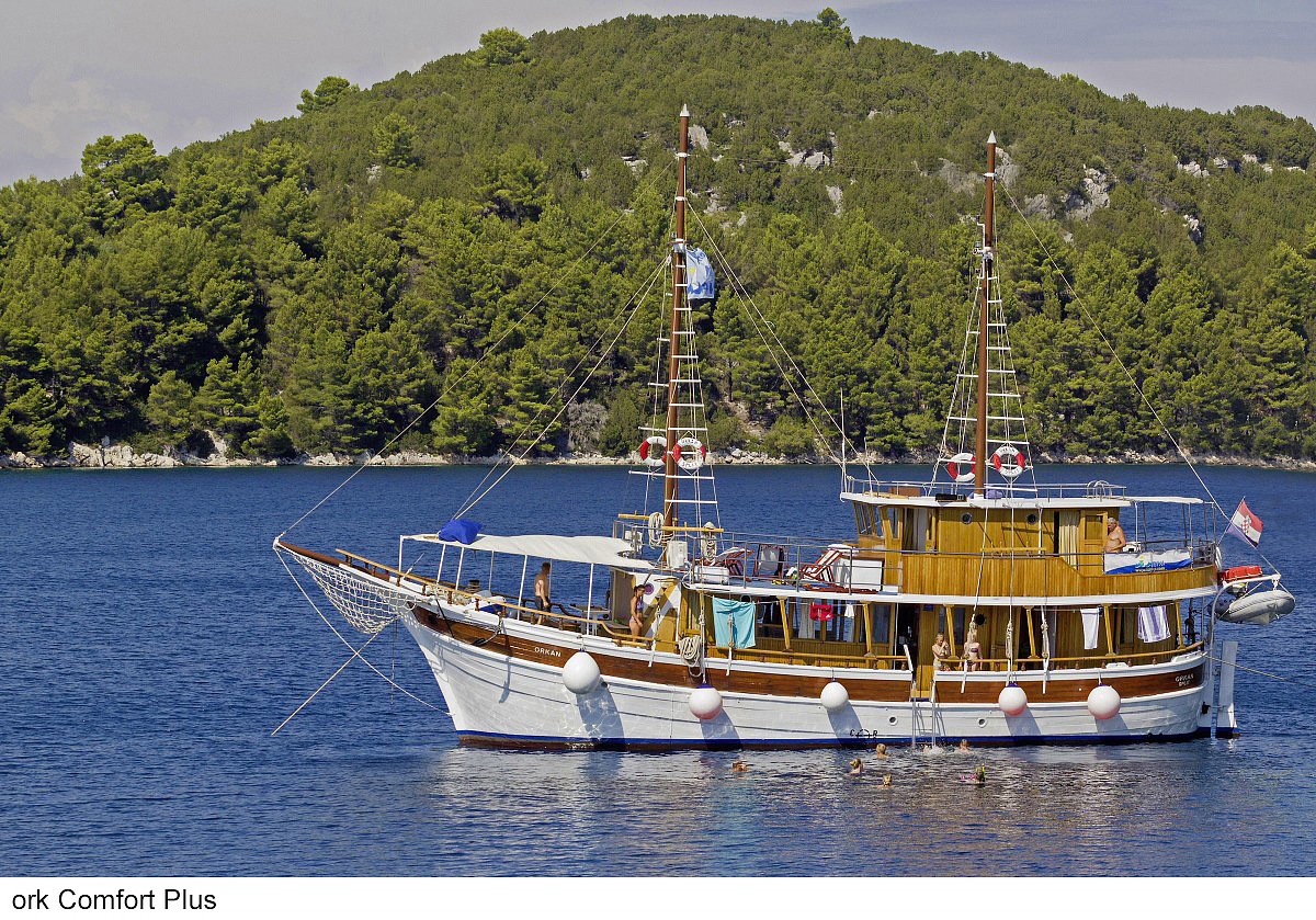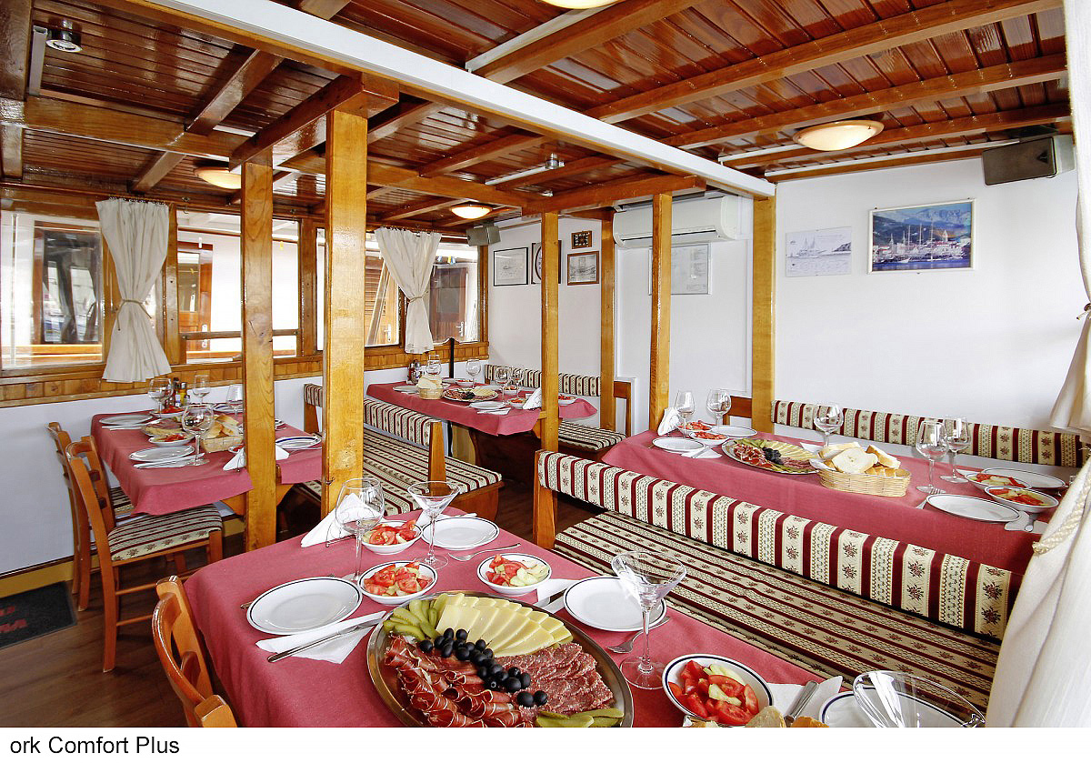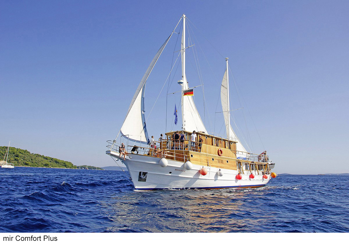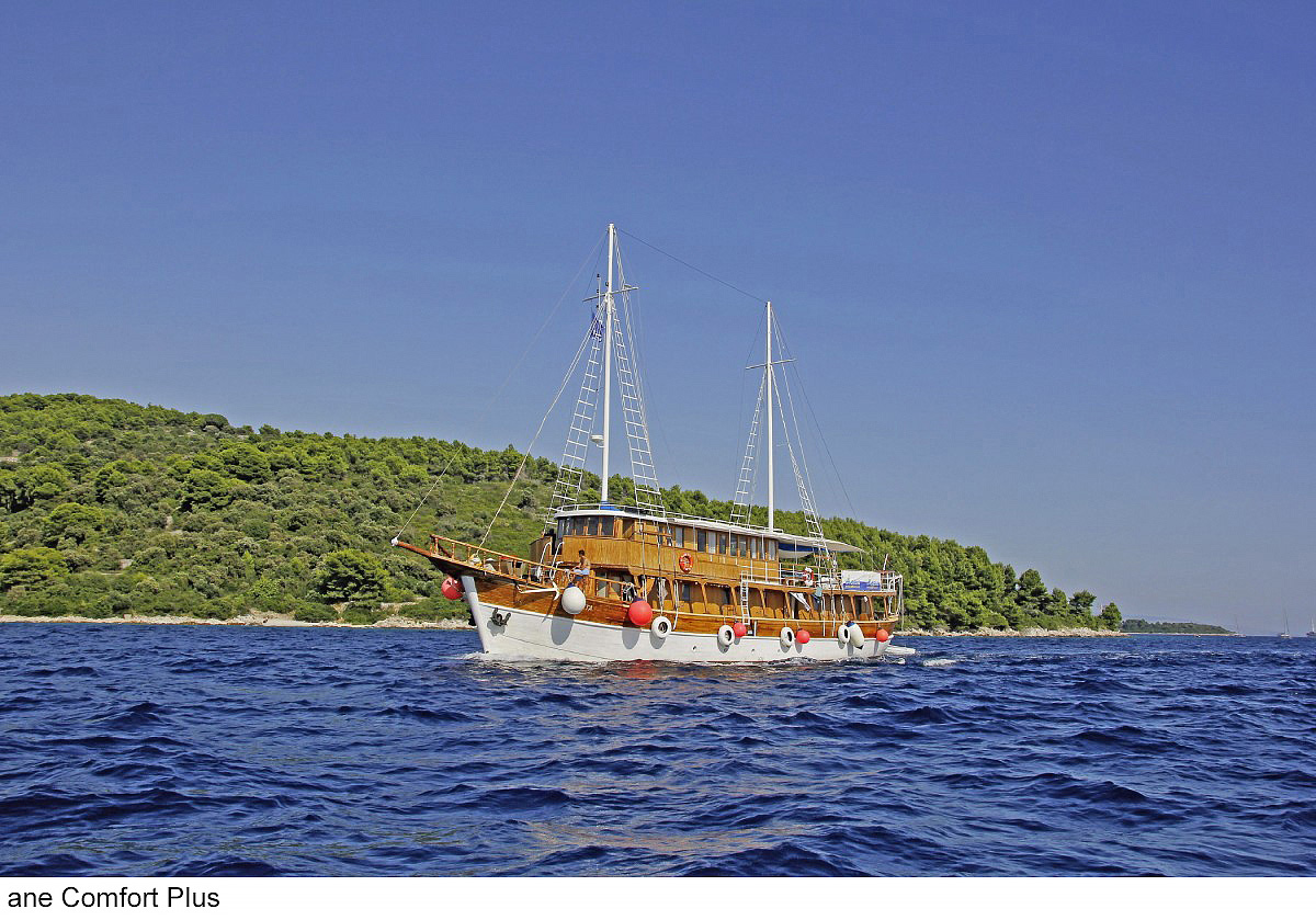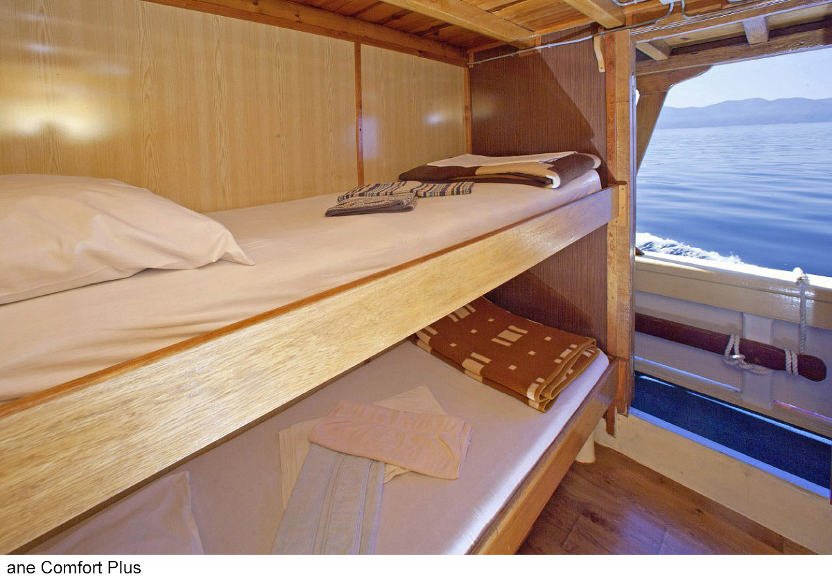 lode kategórie Comfort plus / motorové plachetnice s dreveným alebo oceľovým trupom, lode kategórie Premium / pohodlné a moderne navrhnuté motorové plachetnice a motorové jachty, väčšinou s oceľovým trupom, väčšina plavidiel má kúpaciu plošinu vzadu, lode kategórie Deluxe / luxusné motorové jachty s oceľovým trupom, krytý salónik na hornej palube a kúpacia plošina vzadu. Za príplatok je možné rezervovať kajutu na palube, len vopred a na vyžiadanie. U kategórie Comfort plus voda zo sprchy odteká do podlahovej vpusti, nejedná sa o sprchový kút a nie je oddelená závesom.