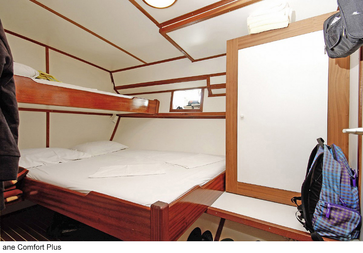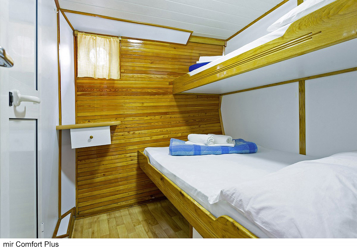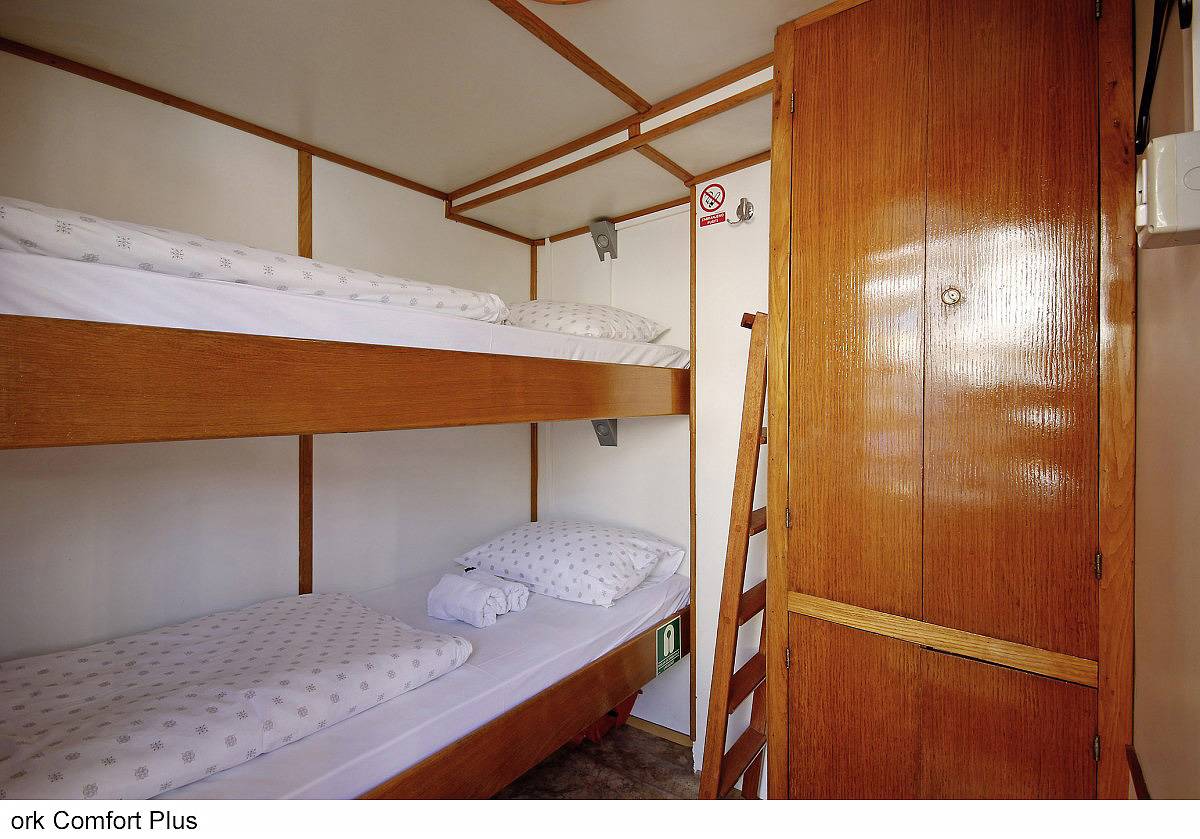 kajuta s poschodovou posteľou alebo francúszkym lôžkom, vlastné sociálne zariadenie so sprchou a WC, popis platí i pre Comfort plus 1