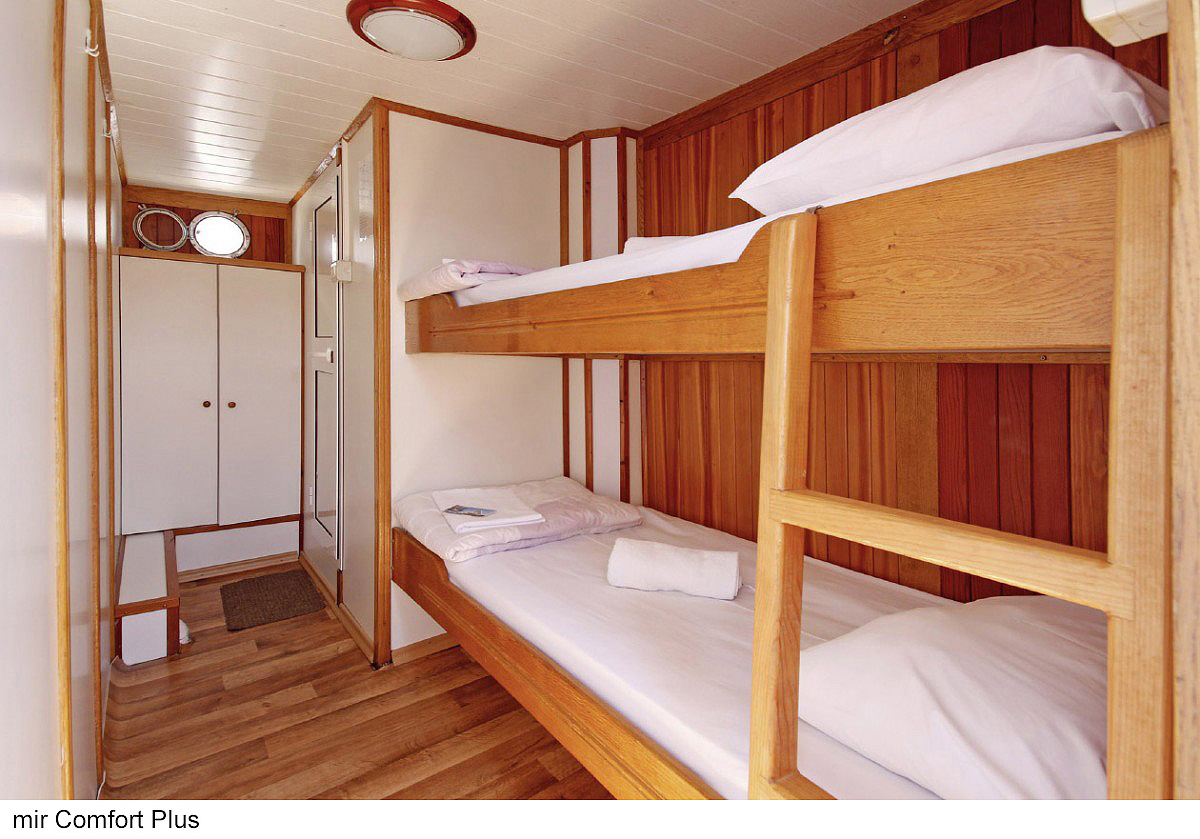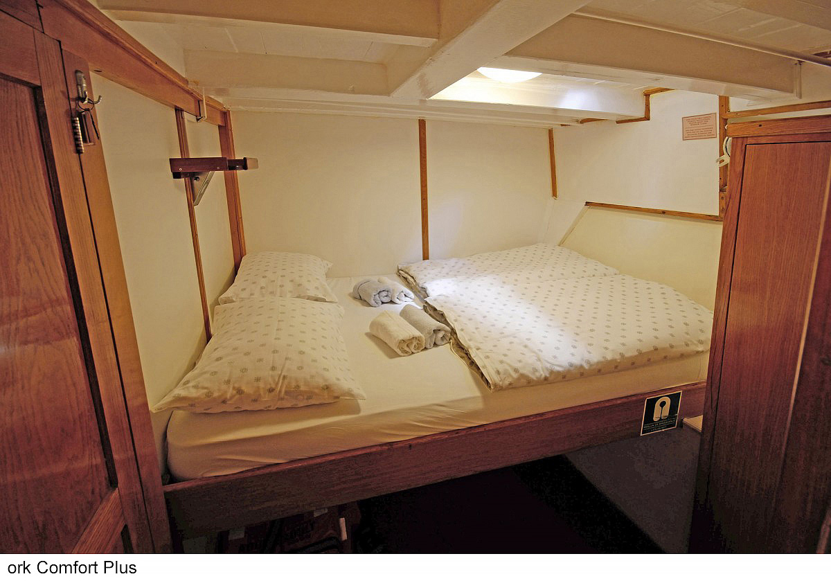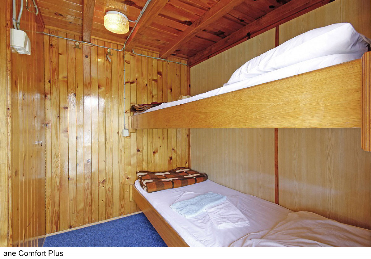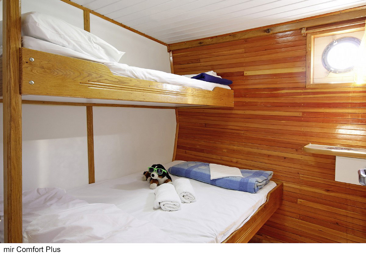 kajuta s poschodovou posteľou alebo francúszkym lôžkom, vlastné sociálne zariadenie so sprchou a WC, popis platí i pre Comfort plus 1