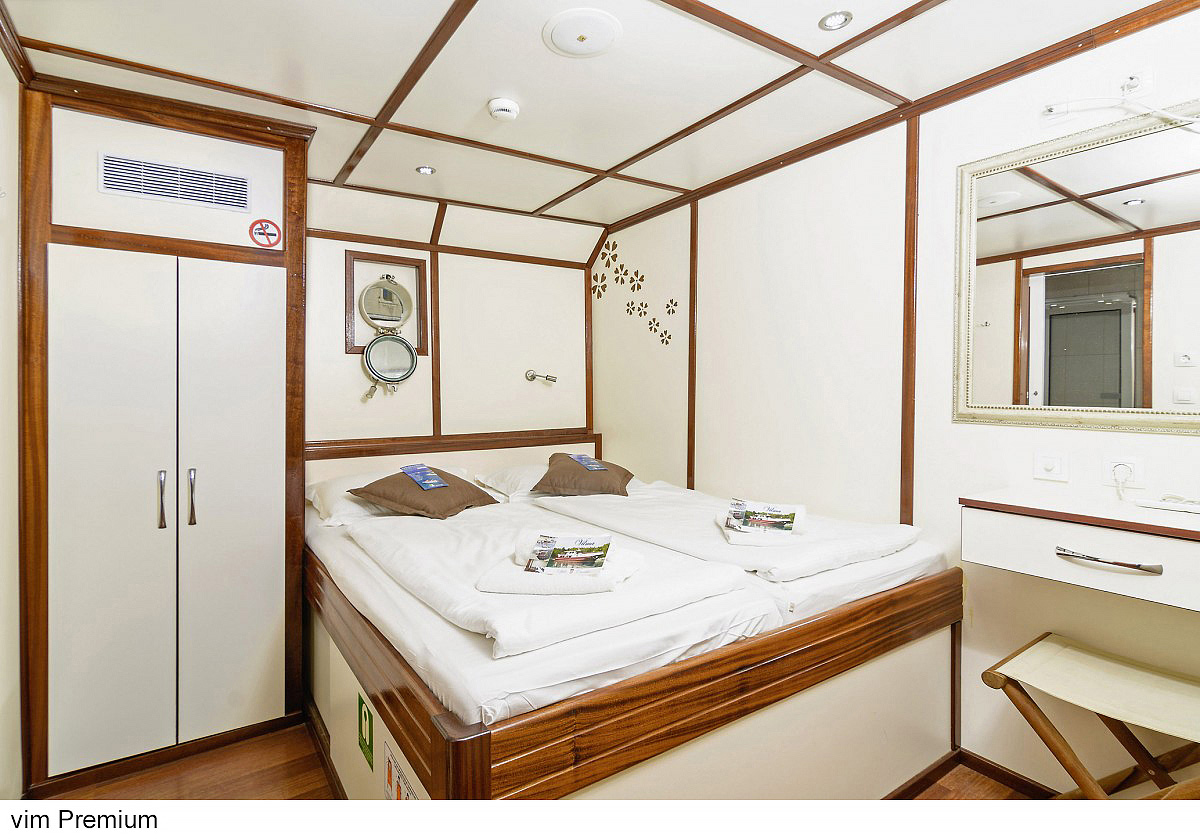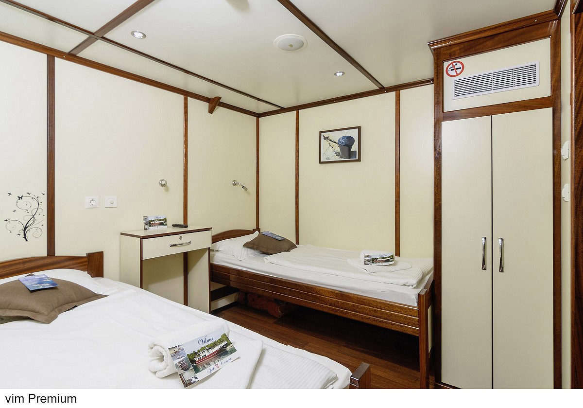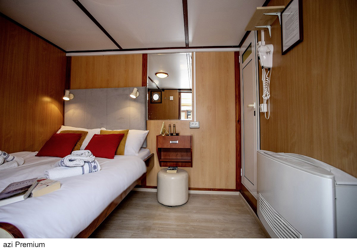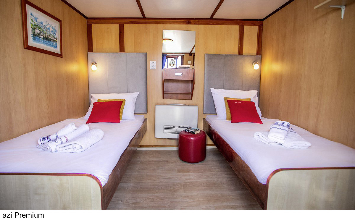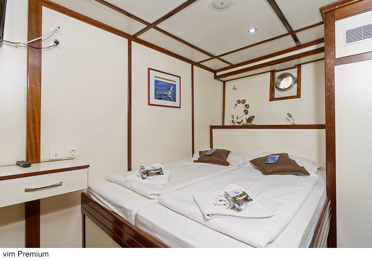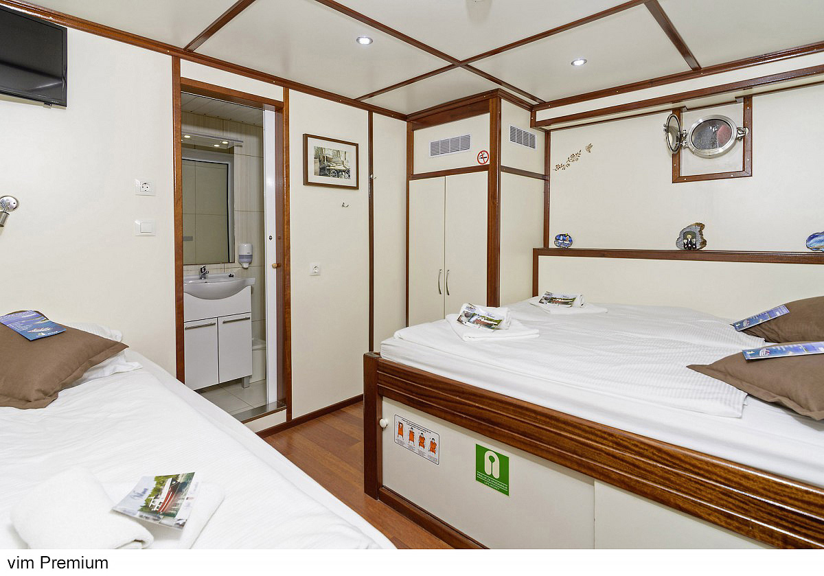 kajuta s dvomi oddelenými lôžkami alebo manželskou posteľou, vlastné sociálne zariadenie so sprchou a WC, popis platí i pre Premium 1