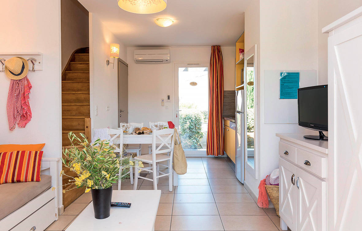 trilo 8 mezzanine - 67 m² - 1 spálňa s manželskou posteľou, 1 spálňa s 2 samostatnými lôžkami, medziposchodie s 1 manželskou posteľou, obývacia izba s kuchynským kútom a rozkladacím gaučom pre 2 osoby (možný i typ "zásuvka"), sociálne zariadenie s vaňou, 2x terasa s posedením