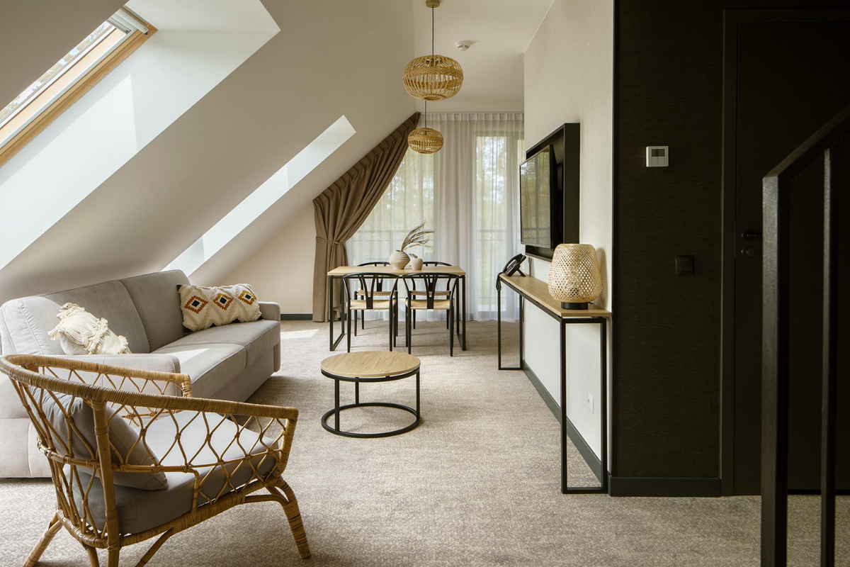 moderný rezort sa skladá z troch budov – Morze, Las a novej budovy Ziemia; nachádza sa v pokojnej časti mesta Łeba medzi Baltským morom a Sarbrským jazerom