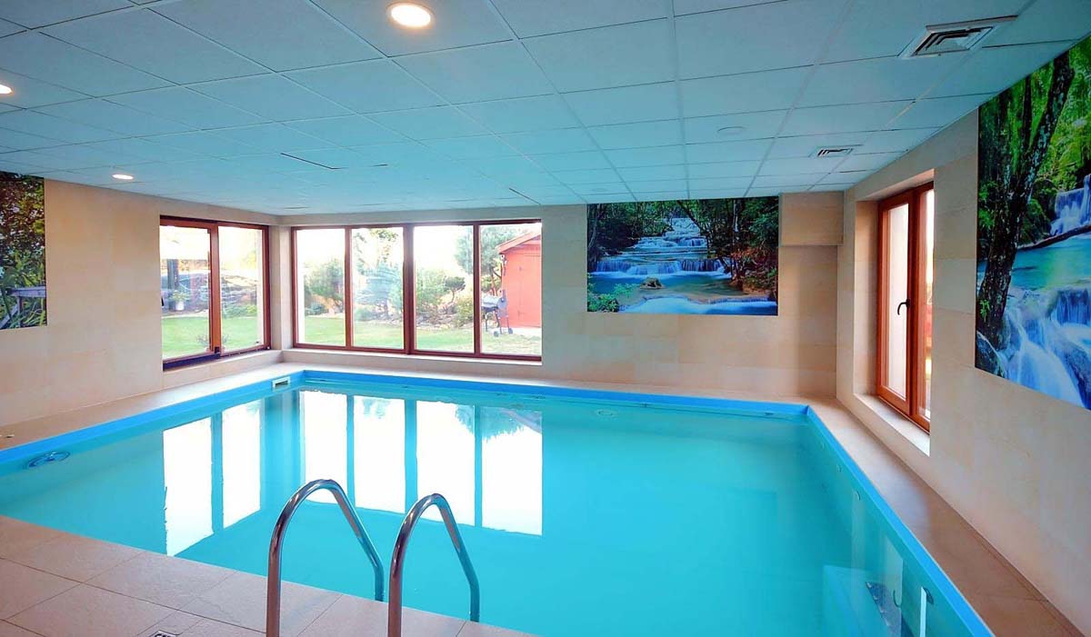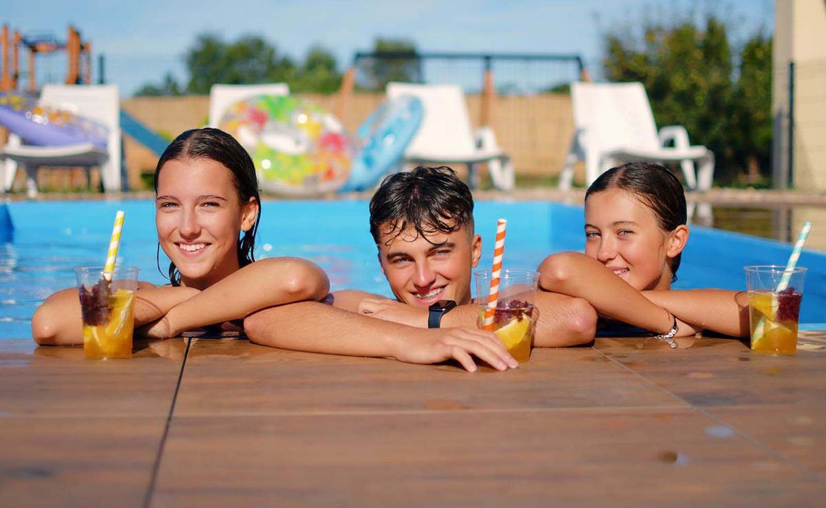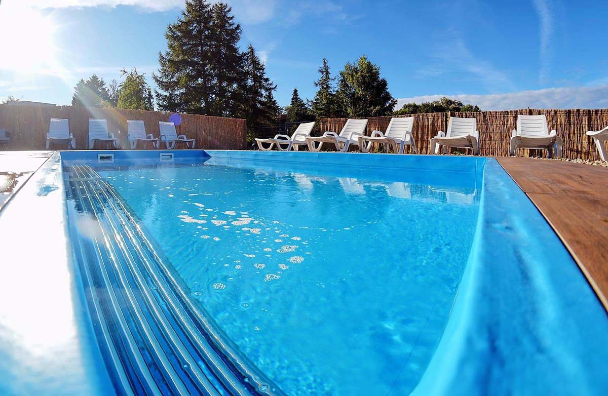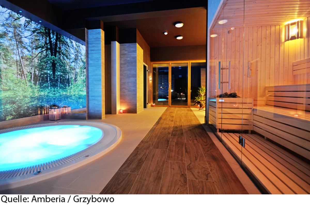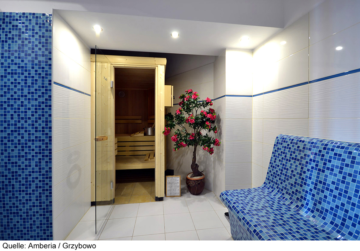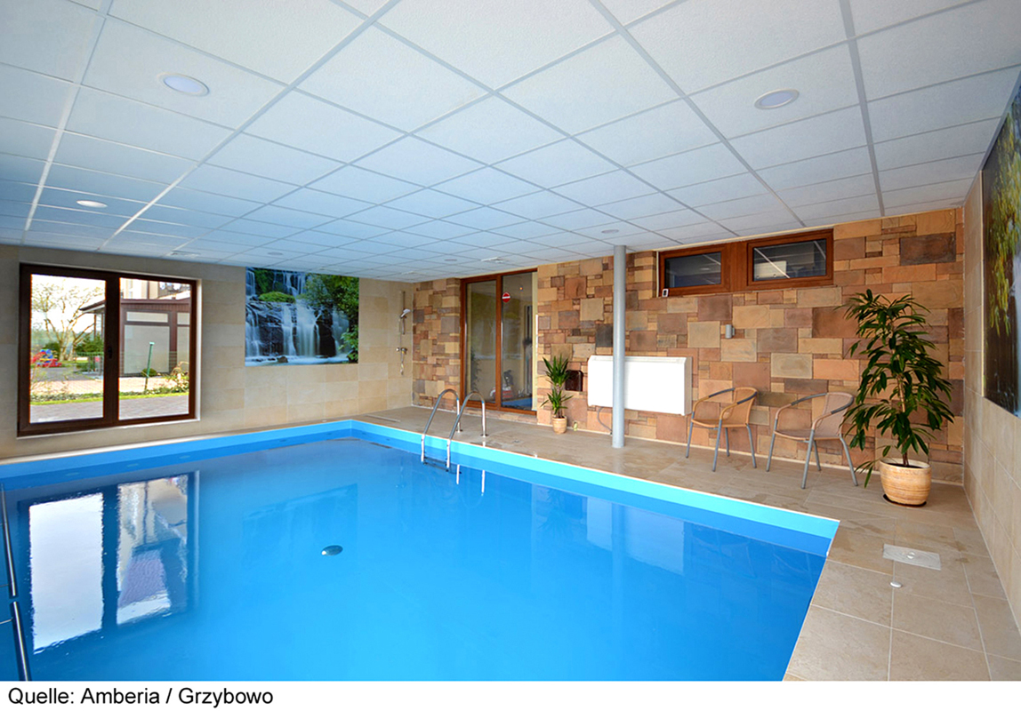 vonkajší bazén 15 m² (jún – september podľa počasia), vnútorný bazén 28 m², sauna, masáže*, kozmetické služby*, relaxačný kútik, stolný futbal*, požičovňa bicyklov*