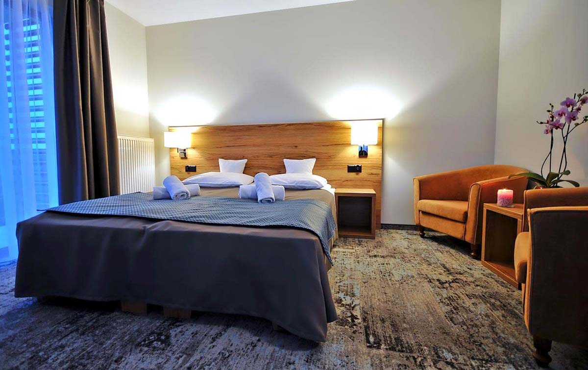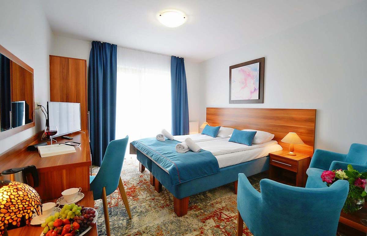 22 m² – izba s manželskou posteľou a rozkladacou pohovkou (prístelka pre 1 osobu), sociálne zariadenie so sprchou, balkón