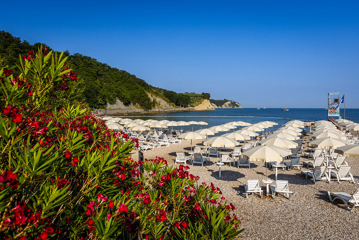 • budovy v zeleni priamo pri okruhliakovej pláži a čistého mora