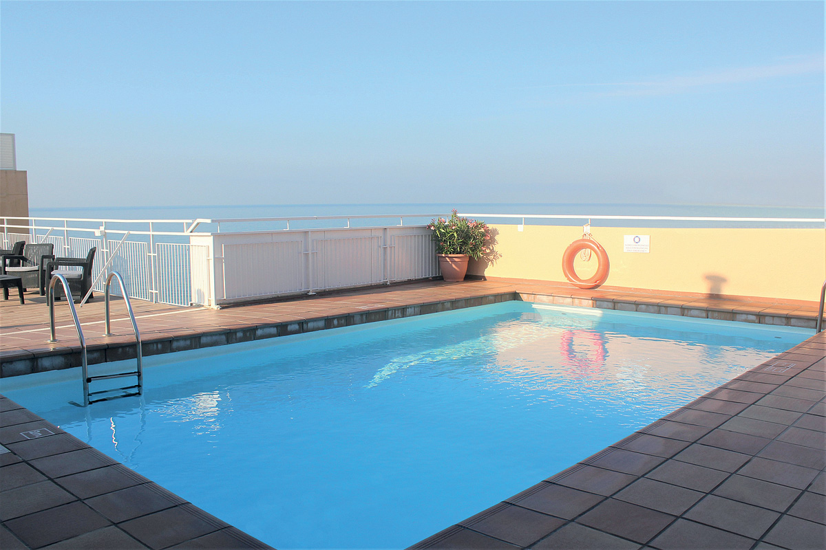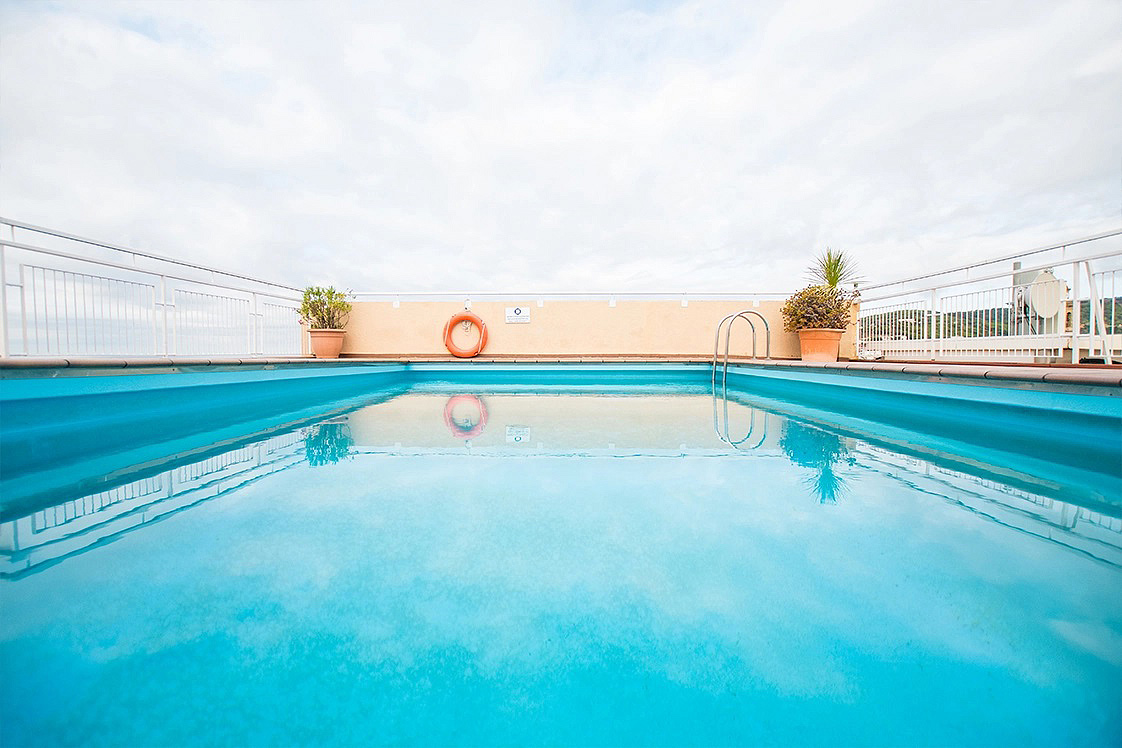 slnečná terasa na streche s ležadlami, malým detským bazénikom s bazénom pre dospelých