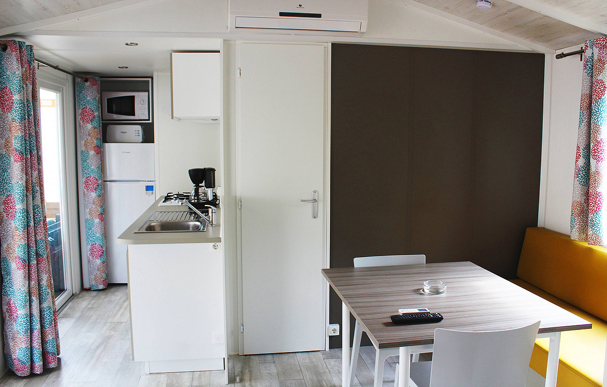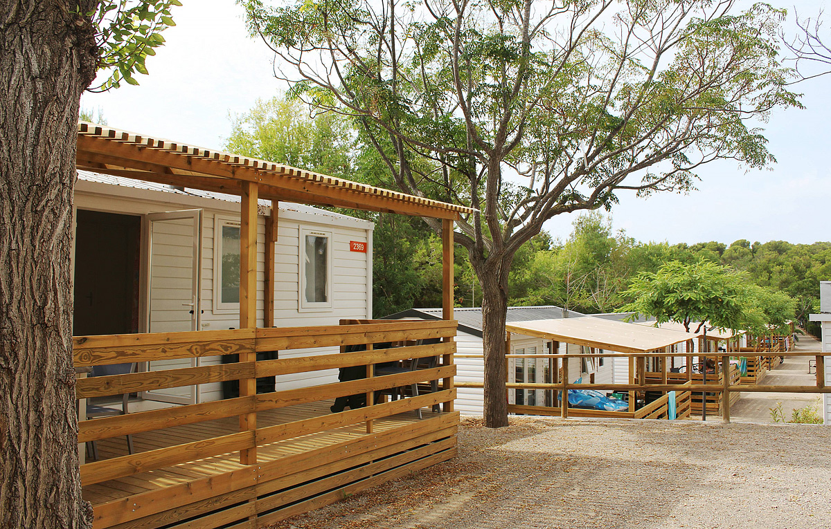 49 m² - 1 spálňa s manželskou posteľou, 1 spálňa s 2 samostatnými lôžkami, 1 spálňa s poschodovou posteľou, obytná časť s kuchynským kútom, sociálne zariadenie so sprchou, čiastočne krytá drevená terasa