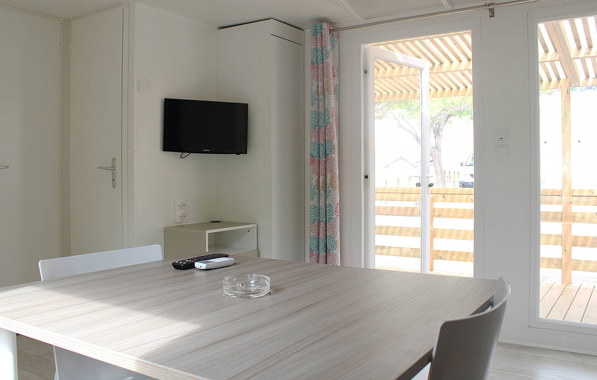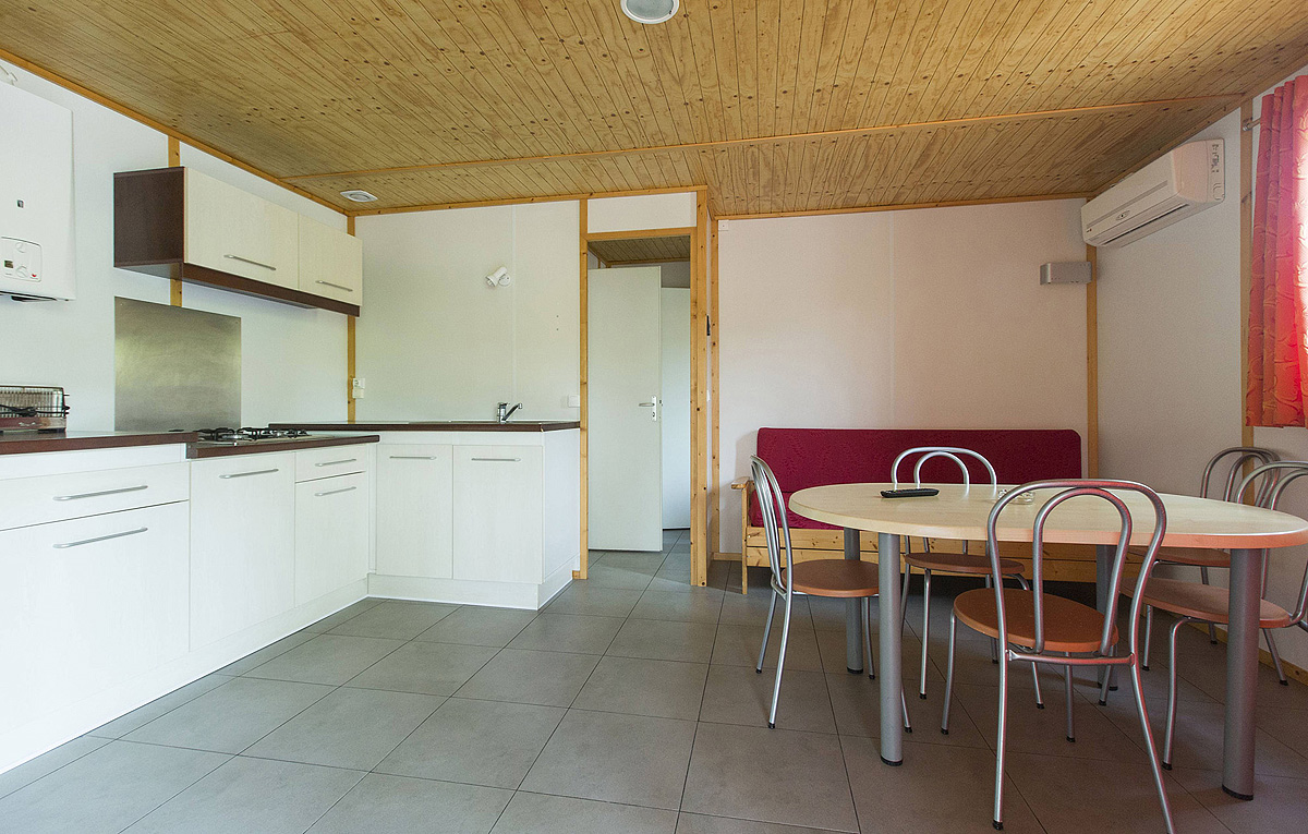 50 m² - 1 spálňa s manželskou posteľou, 1 spálňa s 2 samostatnými lôžkami, obytná časť s kuchynským kútom a rozkladacím gaučom pre 2 osoby, sociálne zariadenie so sprchou, čiastočne krytá drevená terasa