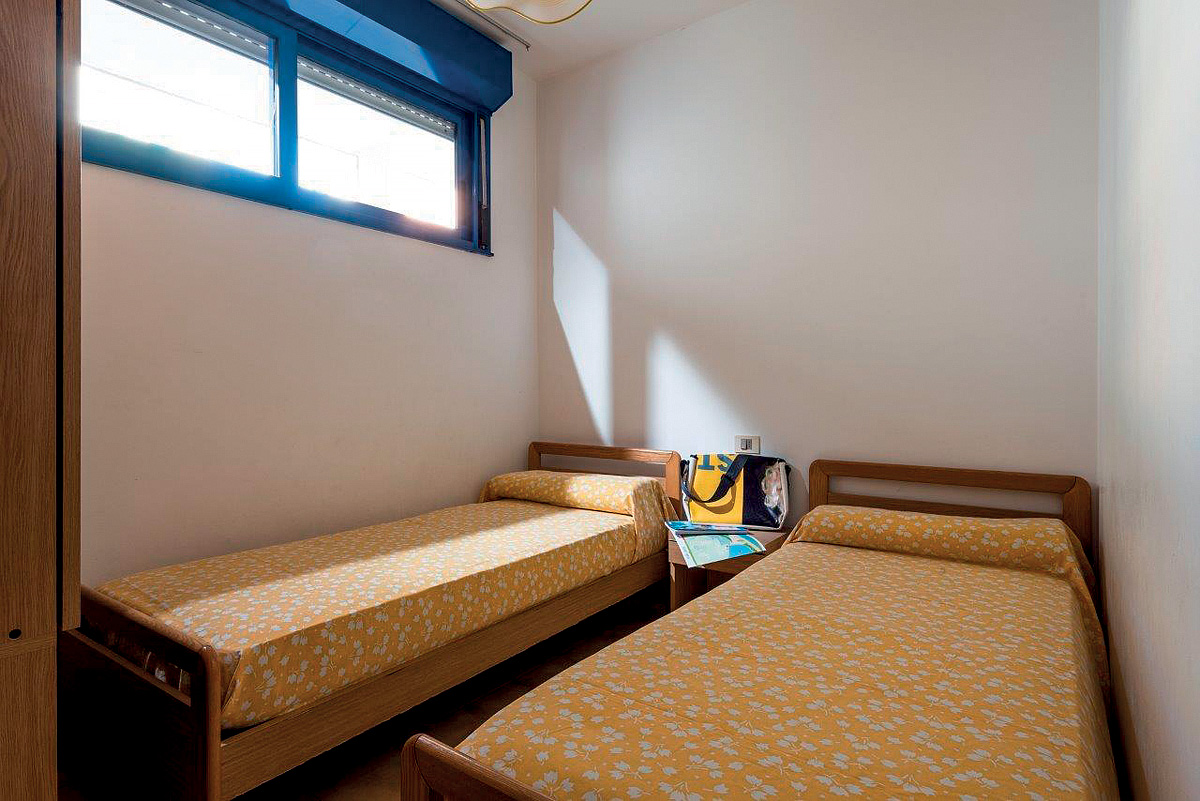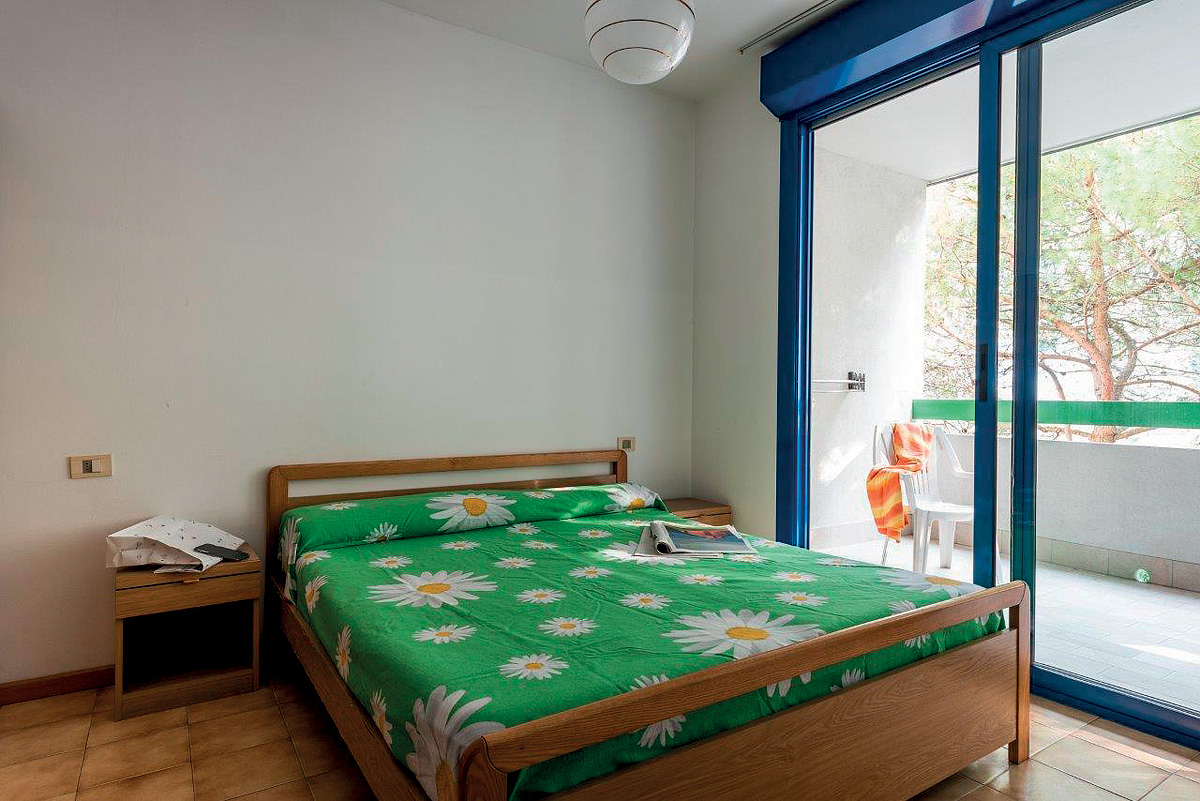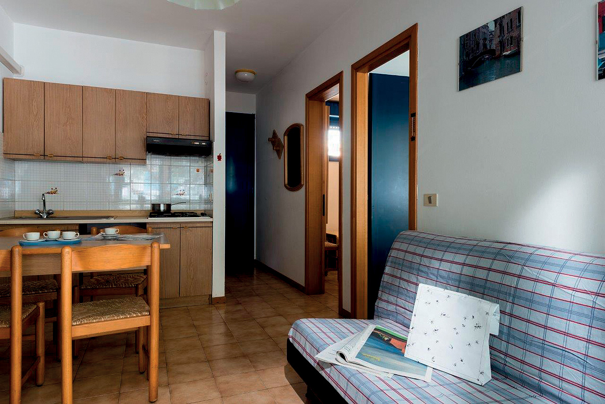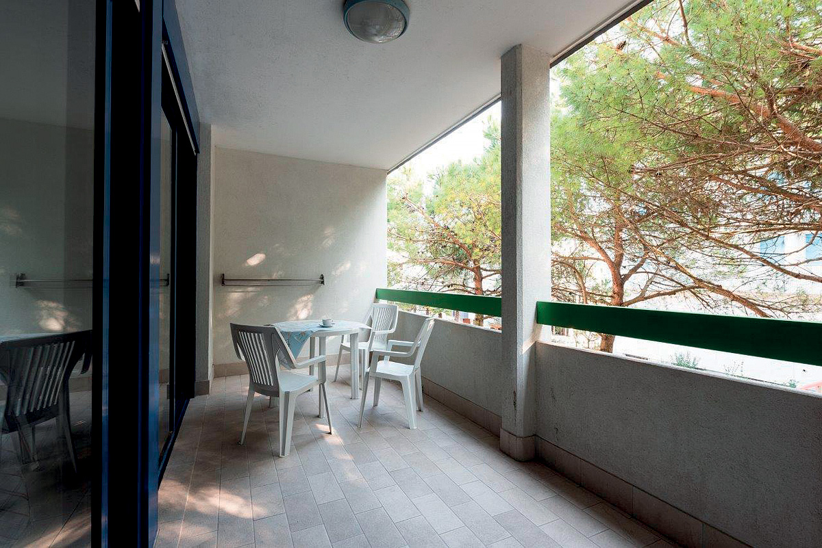 45 m² - 1 spálňa s manželskou posteľou, 1 spálňa s 2 samostatnými lôžkami alebo poschodovou posteľou alebo 1 samostatným lôžkom a poschodovou posteľou, obývacia izba s kuchynským kútom a rozkladacím gaučom pre 2 osoby, sociálne zariadenie so sprchou, balkón; apartmány označené trilo 6/7N sú zrekonštruované