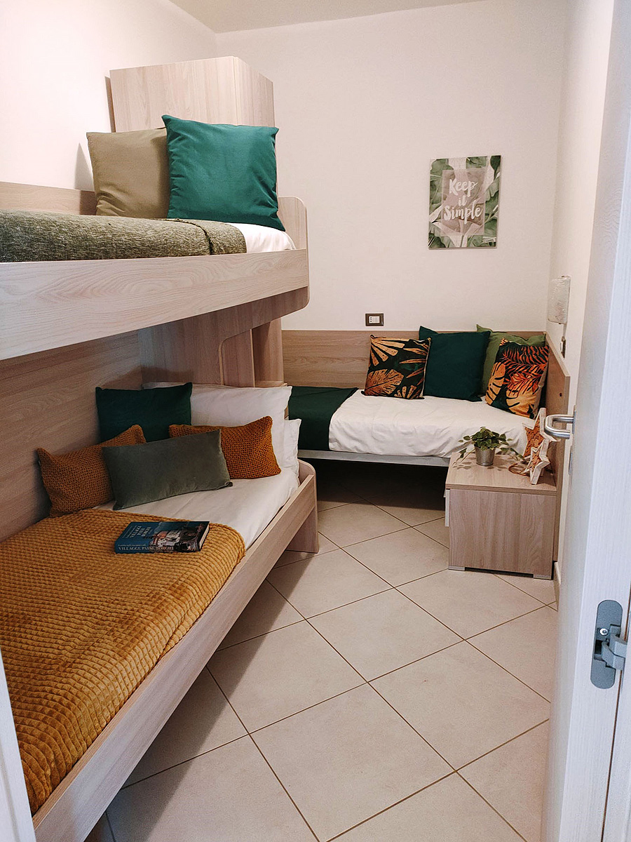 trilo 5 - 1 spálňa s manželskou posteľou, 1 spálňa s poschodovou posteľou a jedným samostatným lôžkom, obývacia izba s kuchynským kútom a rozkladacím gaučom pre 1 osobu, sociálne zariadenie so sprchou, menšia terasa so spoločnou záhradou