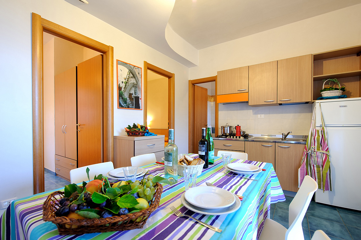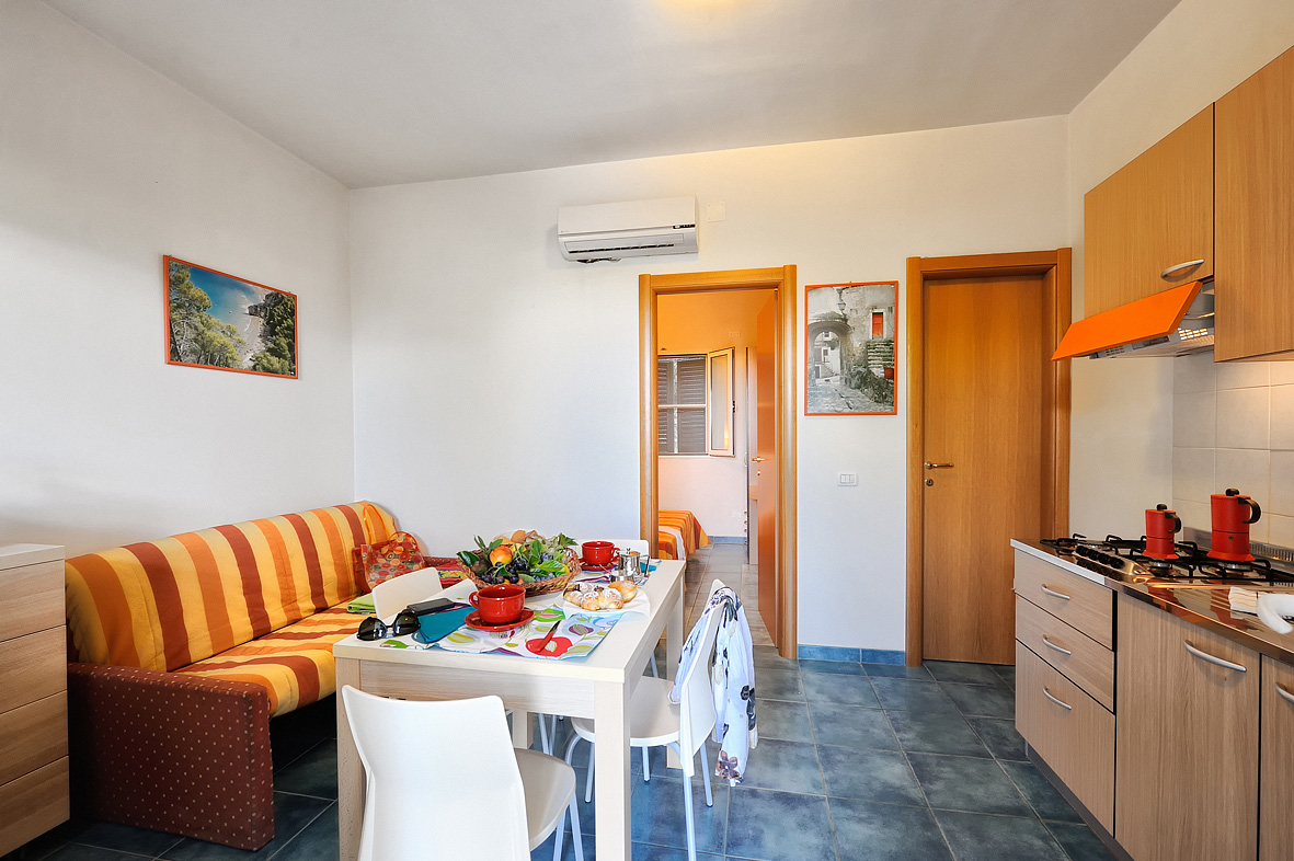 40 m² - spálňa s manželskou posteľou, spálňa s 2 samostatnými lôžkami, obývacia izba s kuchynským kútom, sociálne zariadenie so sprchou, veranda alebo terasa; 200 m od pláže; možnosť 6. lôžka formou prístelky či gauča v obývacej izbe