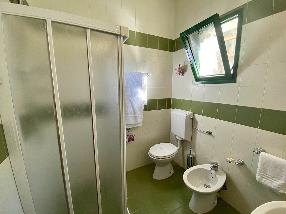 izba s manželskou posteľou či 2 samostatnými lôžkami, sociálne zariadenie so sprchou, balkón s bočným výhľadom na more; 3. lôžko formou prístelky