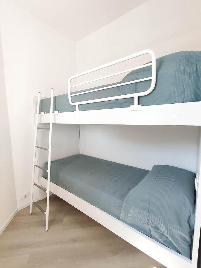 spálňa s manželskou posteľou, mini spálňa s poschodovou posteľou oddelená odhrnovacími dverami, obývacia izba s kuchynským kútom a rozkladacím gaučom pre 1 osobu, sociálne zariadenie so sprchou, balkón