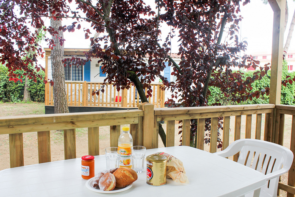 24 m² - spálňa s manželskou posteľou, spálňa s 2 samostatnými lôžkami a 1 zaveseným lôžkom (pre dieťa do 1,50 m a 60 kg), obytná časť s kuchynským kútom a lavicou prestaviteľnou na lôžko, sociálne zariadenie so sprchou, čiastočne krytá drevená terasa