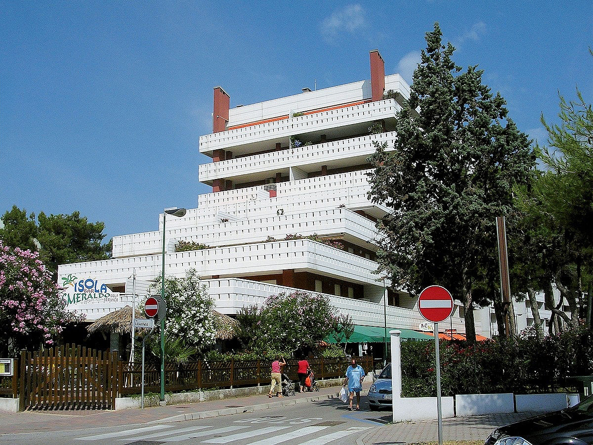 veľká rezidencia so 7 podlažiami a 4 vchodmi v blízkosti bezplatnej pláže, v prízemí s množstvom obchodov, barov a požičovní bicyklov