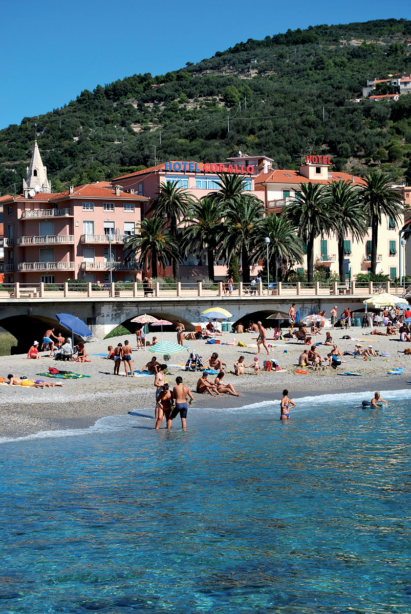 Finale Ligure, centrum - 800 m, pláž / hrubopiesočná, miestami okruhliaková s pozvoľným vstupom do mora - 50 m
