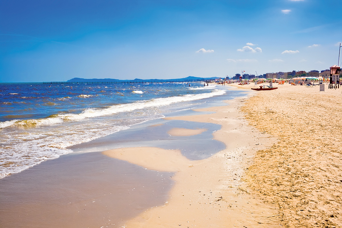 40 km dlhá pláž je tvorená prevažne veľmi jemným pieskom, v priemere dosahuje šírky okolo 50 m a je vyhlásená pozvoľným a bezpečným vstupom do mora, absolútne ideálnym pre malé deti a neplavcov. Plávať sa dá spravidla až vo vzdialenosti od 100 až 150 metrov od brehu, za vlnolamy, vďaka ktorým je hladina pri brehu takmer úplne pokľudná. Voda tu býva kvôli jemnému piesku pri brehu často ľahko zakalená, nie je však žnečistená. Tunajšie more nie je vhodné pre potápenie a nežijú v ňom nebezpeční živočíchovia. K dispozícii sú tu pláže verejné a i pláže súkromné. Na každodenne udržiavaných súkromných plážach si je možné prenajmúť plážový servis, k dispozícii sú tu bary, sociálne zariadenie, sprchy a pri niektorých i reštaurácie, športové zázemie (ihrisko na loptové športy, lodičky, šlapadlá atď.), detské ihriská, animačné programy, plavčíci apod. Voľné pláže sú spravidla len na okrajoch každého strediska, je možné si na ne priniesť čokoľvek vrátane vlastných slnečníkov, ale nie sú pravidelne upravované a nemajú sociálne zariadenie. Pozor, v oblasti Rimini nie je tolerované ako inde v Taliansku pomerne bežné slnenie sa medzi prvou radou slunečníkov súkromných pláží a hranicou mora.