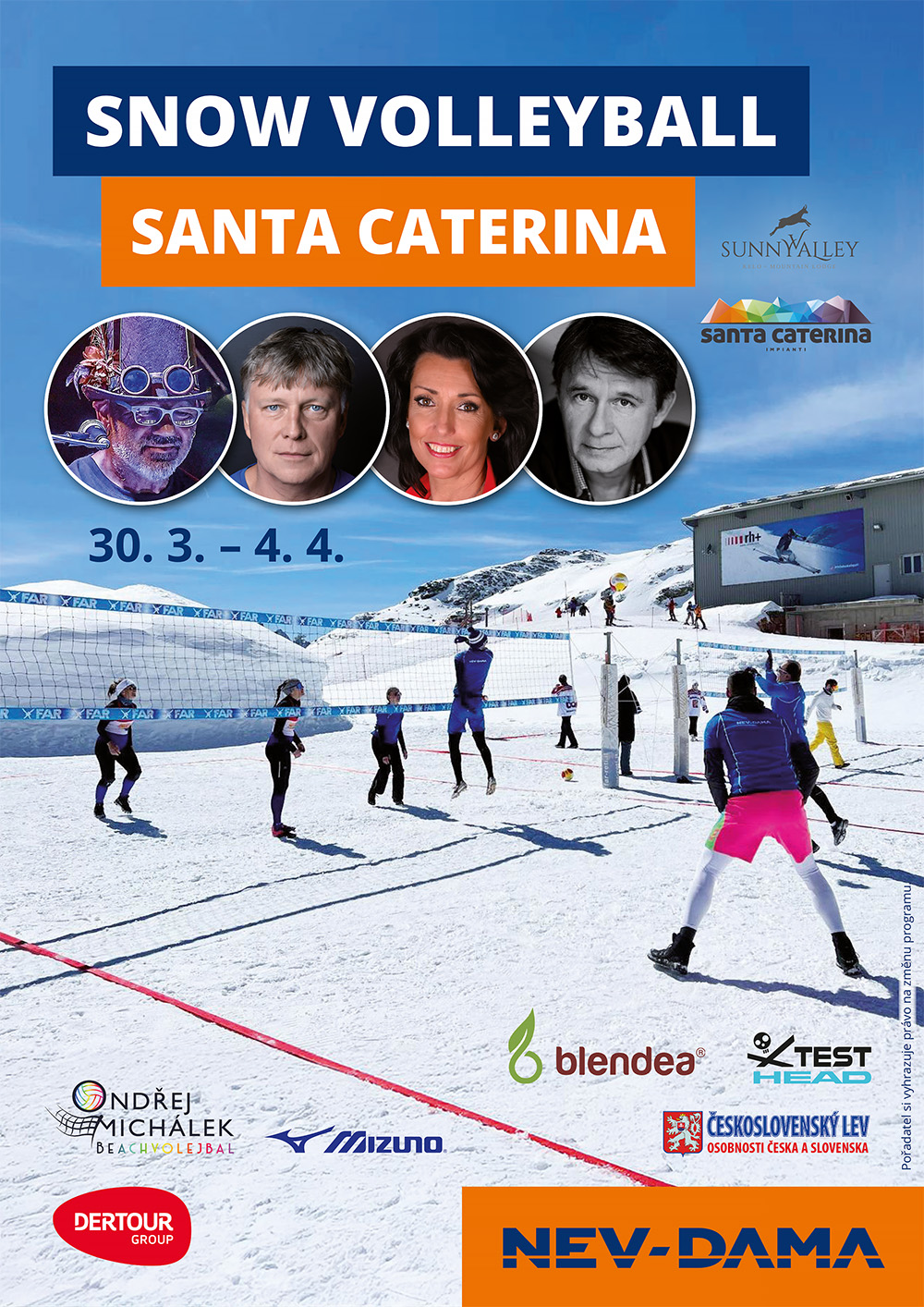 Už piaty raz pre vás usporiadavame medzinárodný turnaj v snow volleyballe. Prihláste sa a užite si volejbal na snehu vo výške 2 700 metrov nad morom pri krásnom rezorte Sunny Valley v talianskom stredisku Santa Caterina. Môžete sa tešiť na koncert speváka Ota Balage, ďalej na Evu Čížkovskú, Michala Dlouhého a Jana Šťastného. Hviezdná účasť je zaistená.