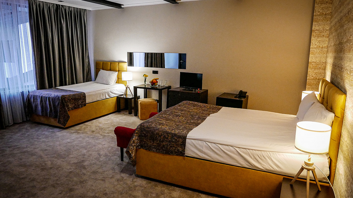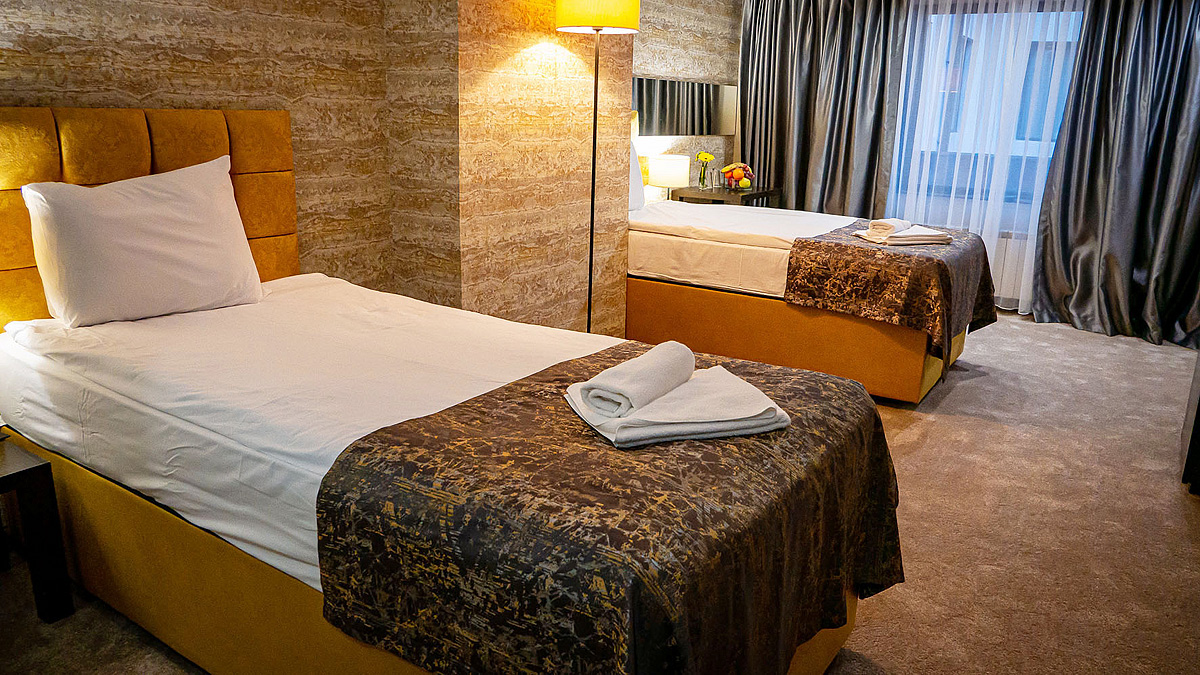 25 až 30 m² – spálňa s manželskou posteľou či s 2 samostatnými lôžkami a možnosťou až 2 prístelok pre 2 deti do nedovŕšených 13 rokov, sociálne zariadenie so sprchou či vaňou, niektoré izby s balkónom*