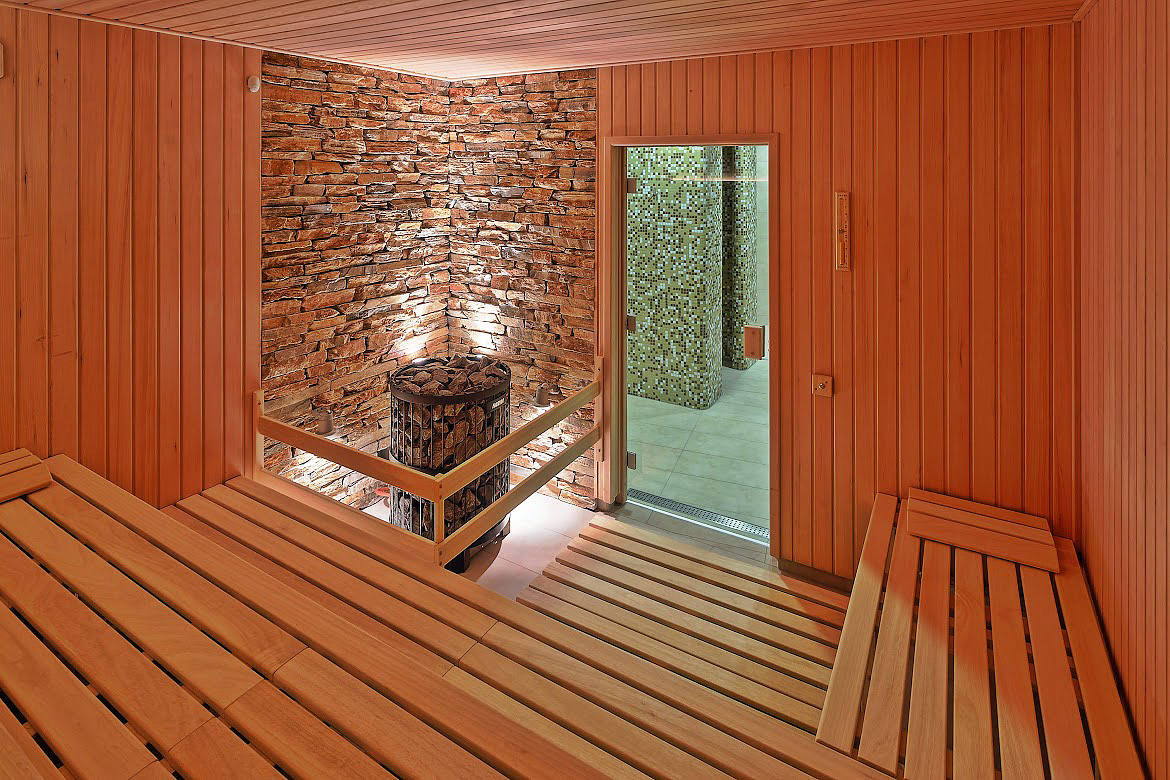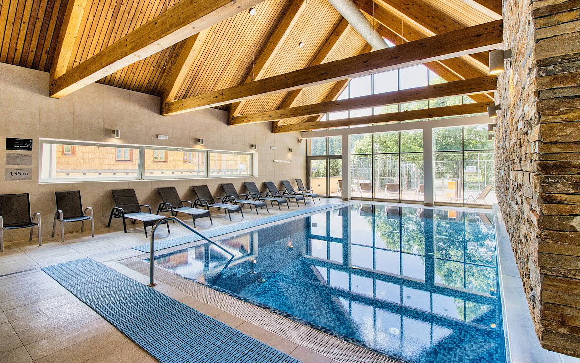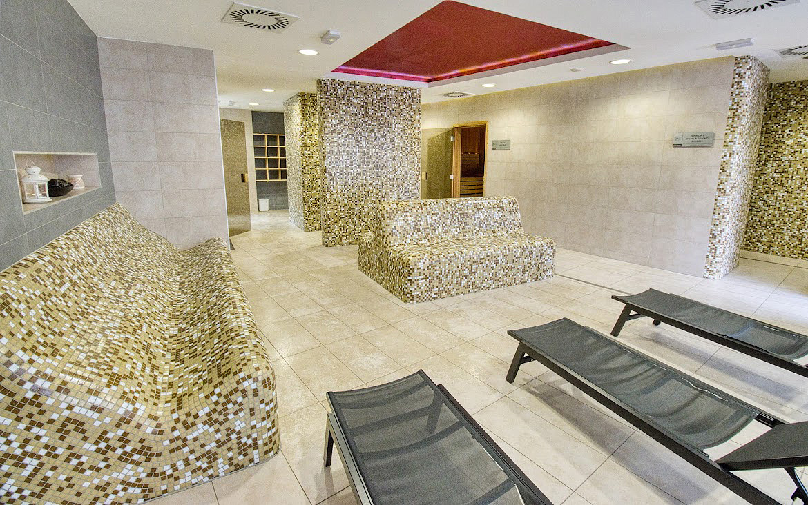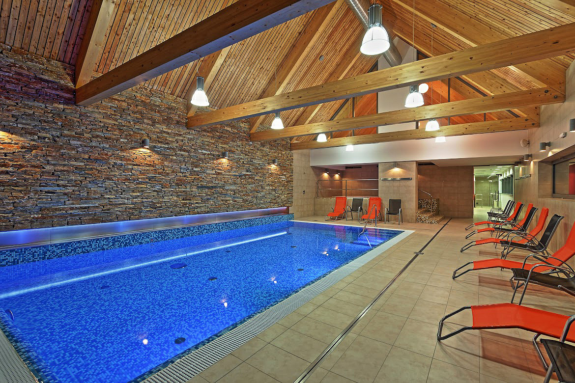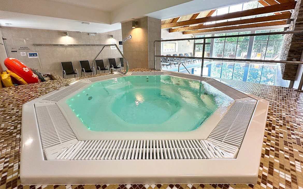 bazén 9,5 x 4,5 m, fínska sauna, bylinková sauna, odpočívareň, vonkajšia ochladzovňa s terasou, whirpool, masáže*, fitness