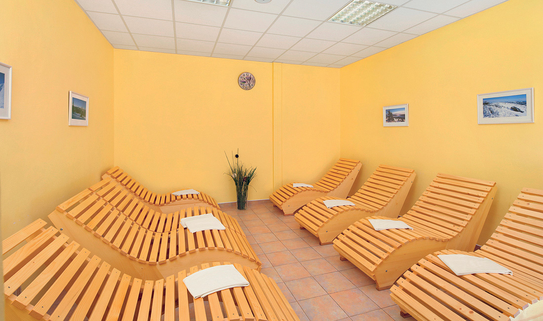 bazén 12,5 x 6,5 m s lehátkami, fínska sauna*, Kneippov chodník*, vírivá kúpeľ, masáže*, rehabilitačné procedúry*, kozmetické služby*, posilňovňa, telocvičňa, biliard*, stolný tenis*, stolný futbal*, šípky*