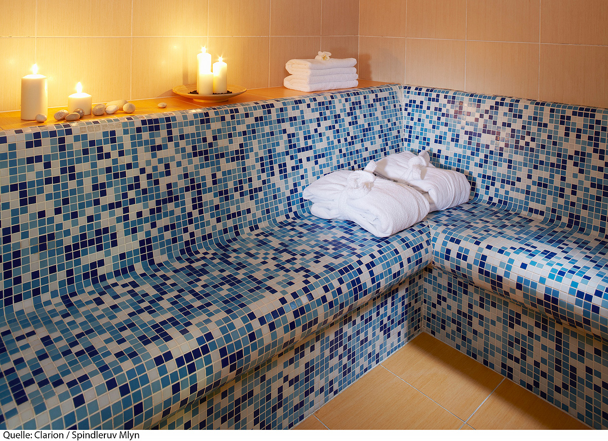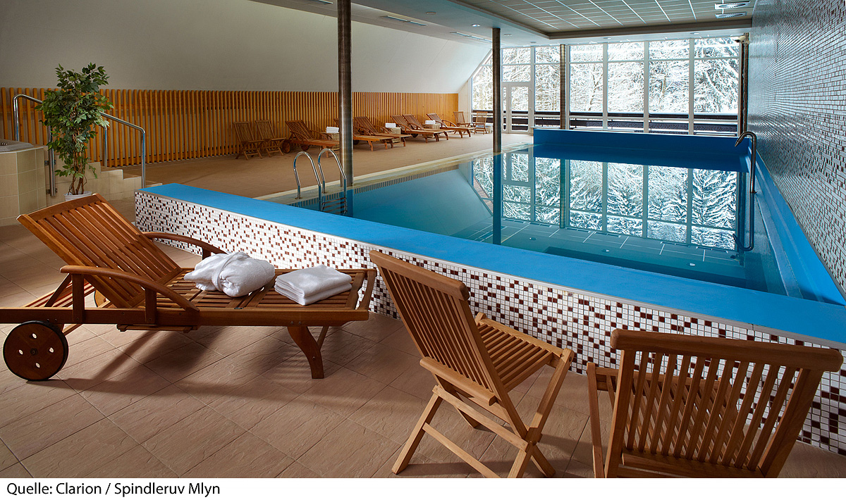 bazén# 12 x 6 m, vírivka#, fínska sauna*, para*, horizontálne solárium*, infrakabína*, relaxačný kútik* s lehátkami, masáže*, posilňovňa#, biliard*; služby označené # majú u pobytov od 2 do 4 nocí vstup zadarmo medzi 9.00 až 12.00 hod. a u pobytov na 7 a viac nocí zadarmo naviac i medzi 14.00 až 21.00 hod.; bazén je od 19.00 hodín prístupný len pre osoby staršie 16 rokov