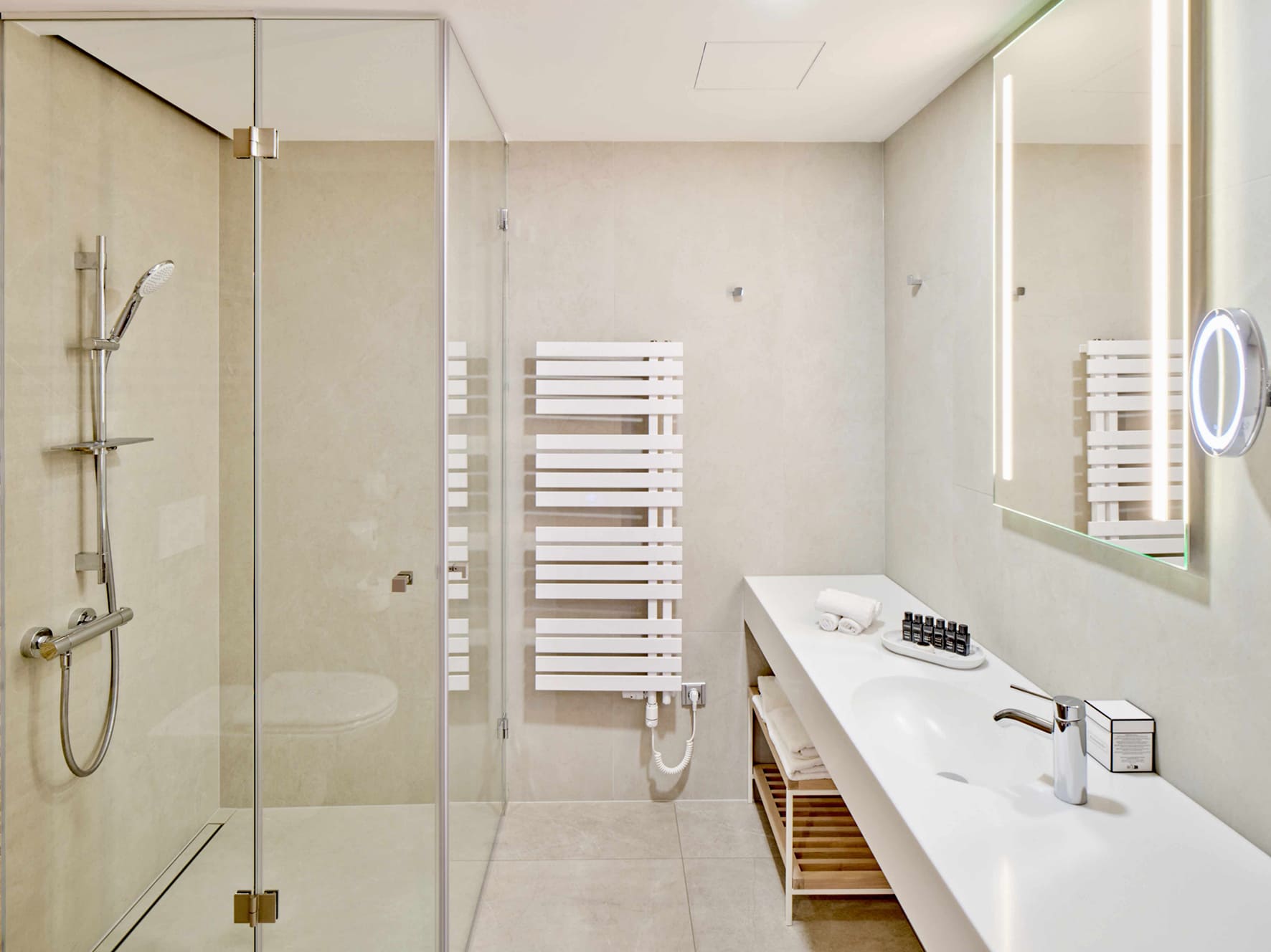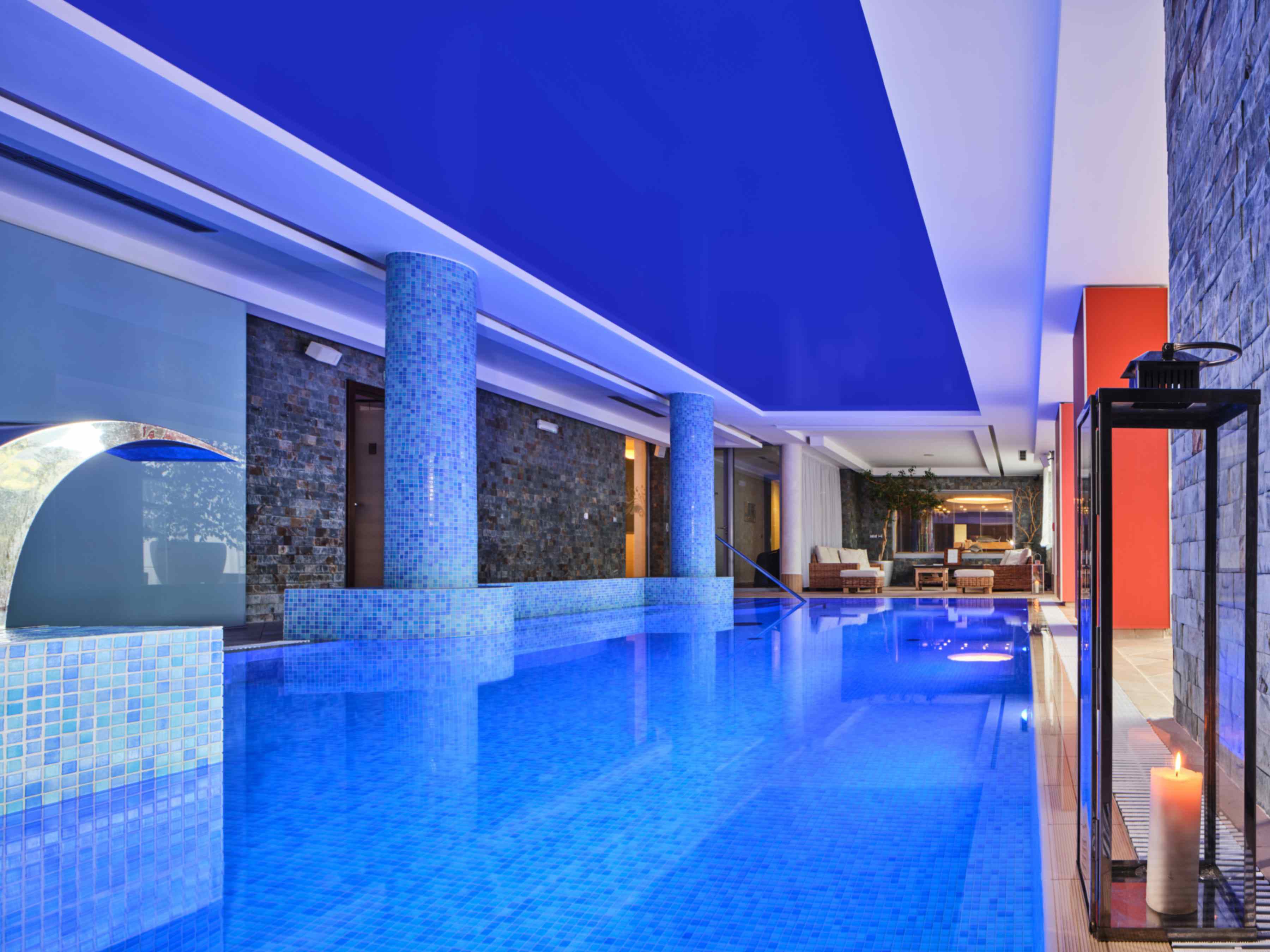 krytý bazén s atrakciami, fínska sauna, parný kúpeľ, odpočinková zóna s vyhliadkou a ochladzovacou terasou, whirpool so slanou vodou, masáže*, L – Spa bar*