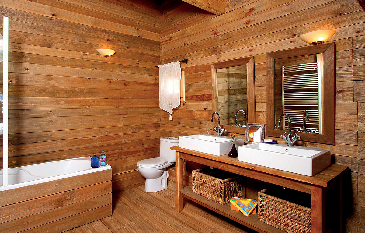 2. podlažie chaletu: obývacia izba s krbom a kuchynským kútom, sociálne zariadenie s vaňou, terasa;