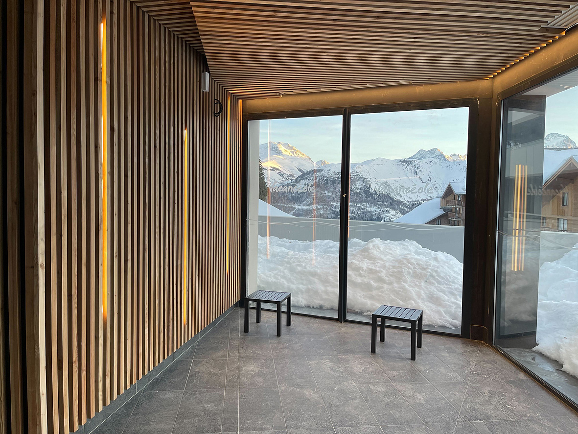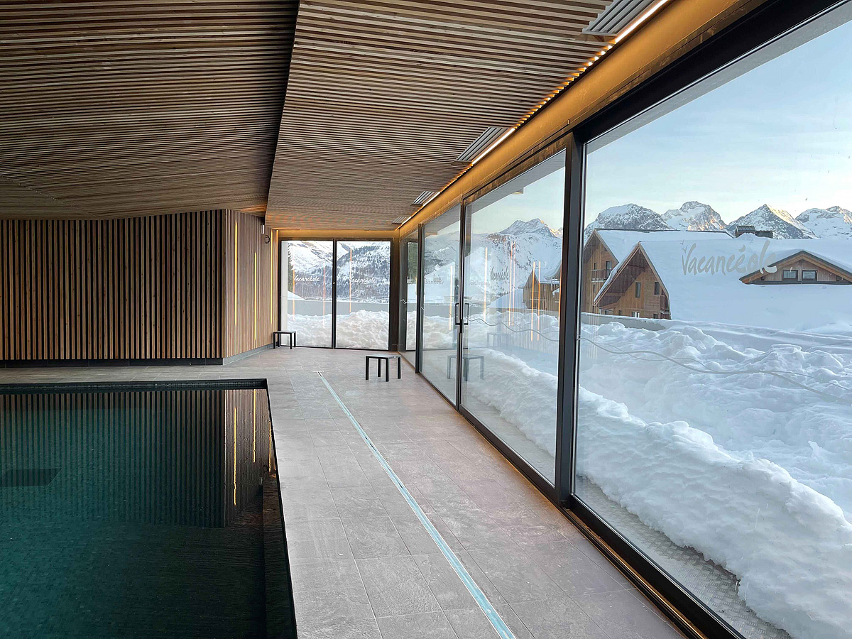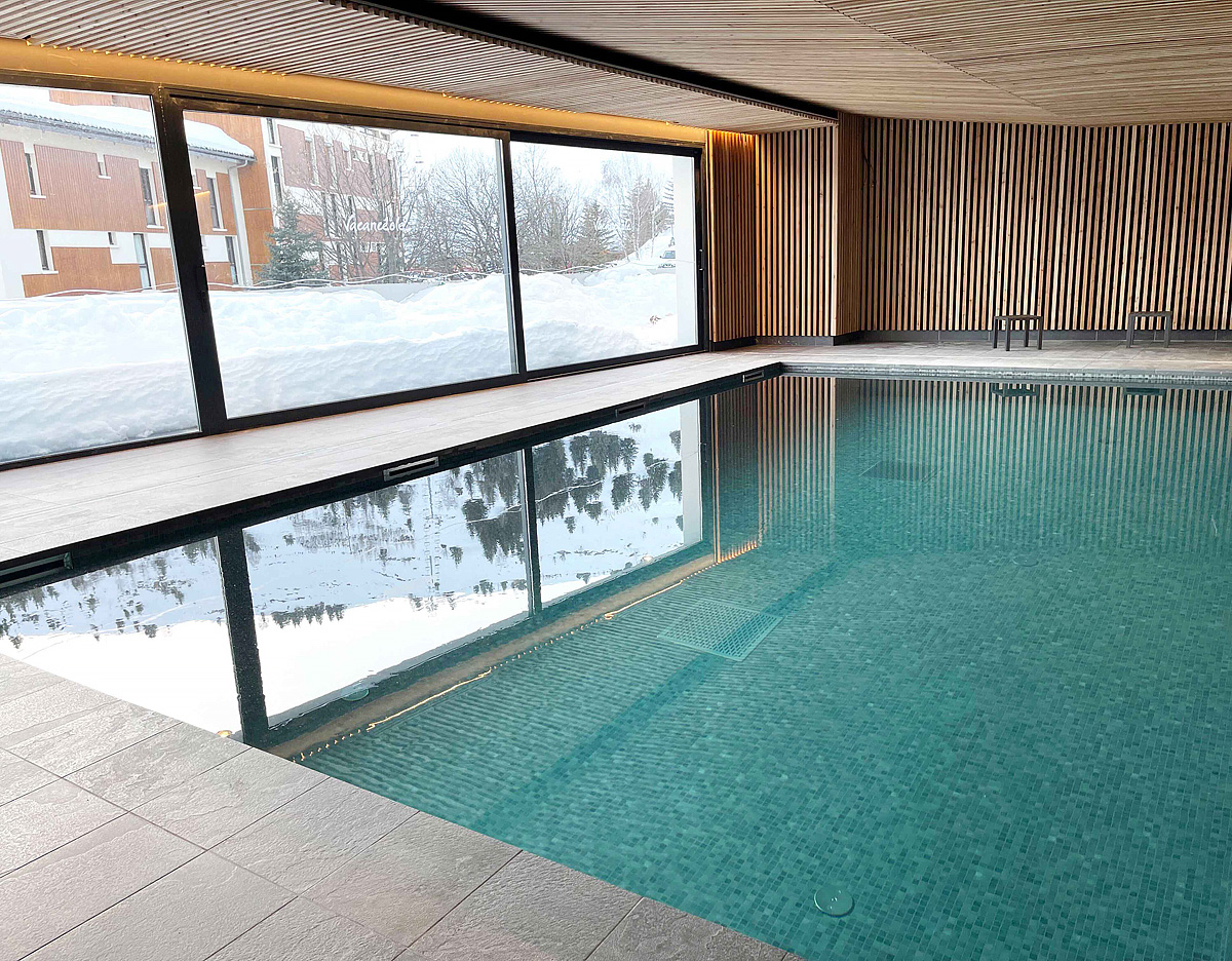 100 m² - 2 spálne s 2 samostatnými lôžkami, 1 spálňa s poschodovou posteľou, obývacia izba s kuchynským kútom a rozkladacím gaučom pre 2 osoby (možný i typ "zásuvka"), 2x sociálne zariadenie, balkón či terasa; apartmány sú spravidla dvojpodlažné
