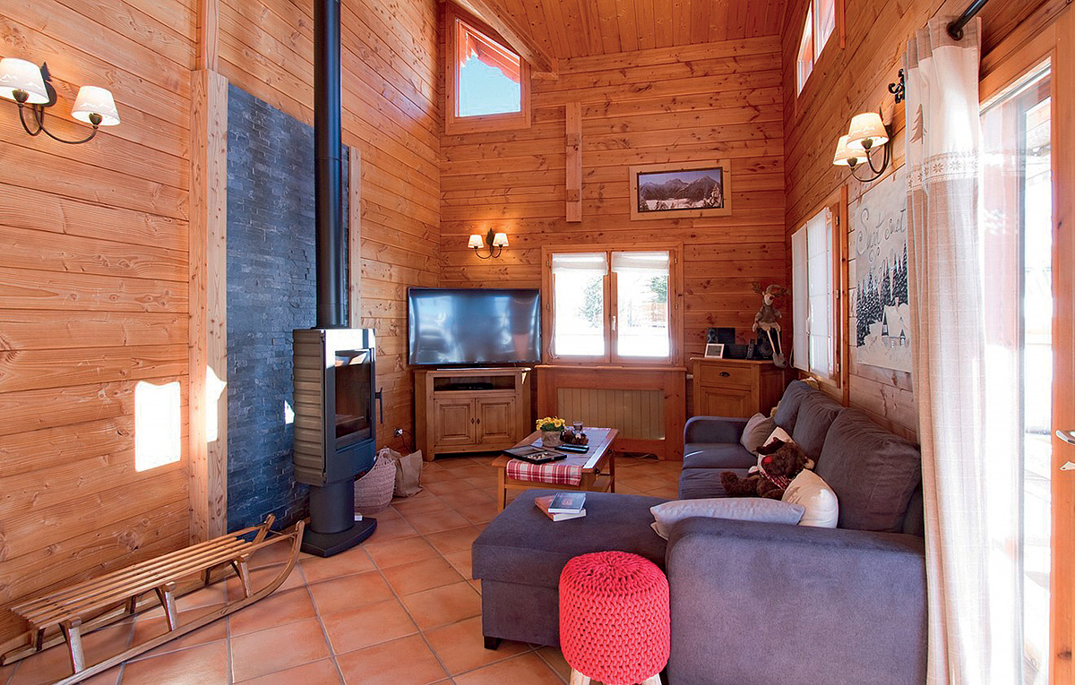 2. poschodie chaletu: 1 spálňa s manželskou posteľou, obývacia izba s krbom a kuchynským kútom, sociálne zariadenie, terasa s vírivkou