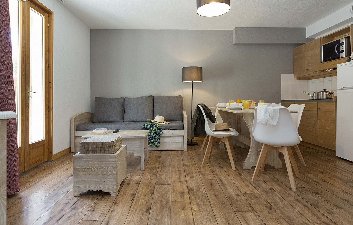 35 m² 1 spálňa s manželskou posteľou či 2 samostatnými lôžkami, 1 spálňa s poschodovou posteľou či 2 samostatnými lôžkami, obývacia izba s kuchynským kútom a rozkladacím gaučom pre 2 osoby (možný i typ „zásuvka“), sociálne zariadenie so sprchou či vaňou (oddelené WC), terasa; niektoré apartmány sú dvojpodlažné