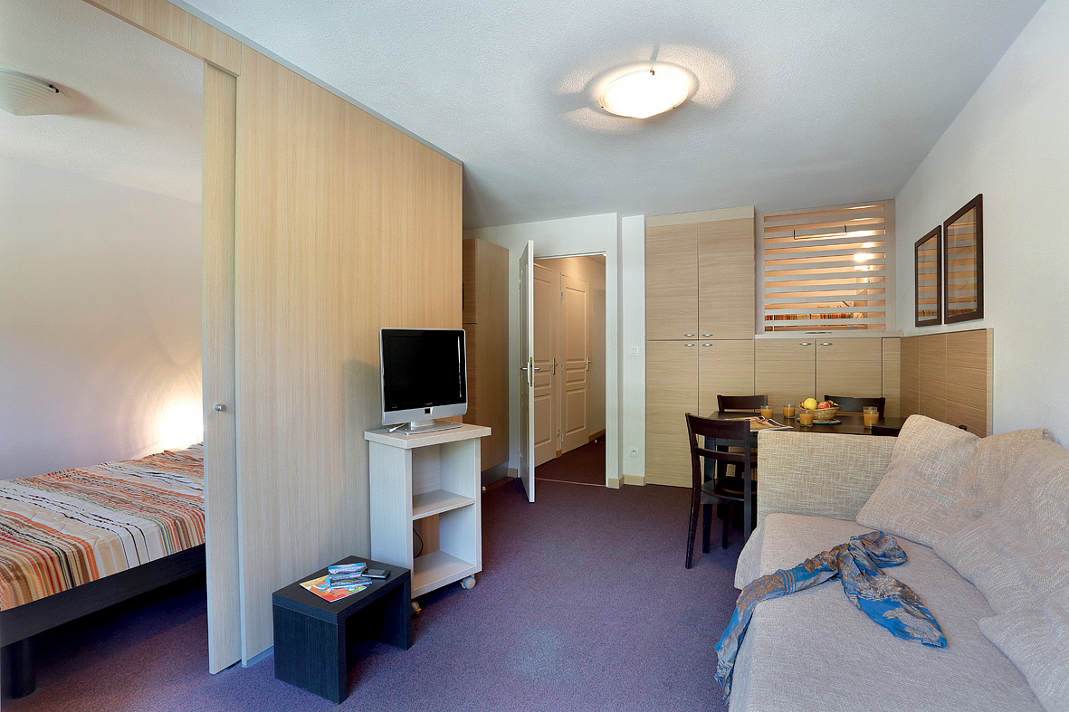 studio 4 - 30 m² - obývacia izba s kuchynským kútom a rozkladacím gaučom pre 2 osoby (možný aj typ "zásuvka"), kabína alebo vstupná miestnosť s 2 samostatnými lôžkami, sociálne zariadenie s vaňou, spravidla balkón alebo terasa