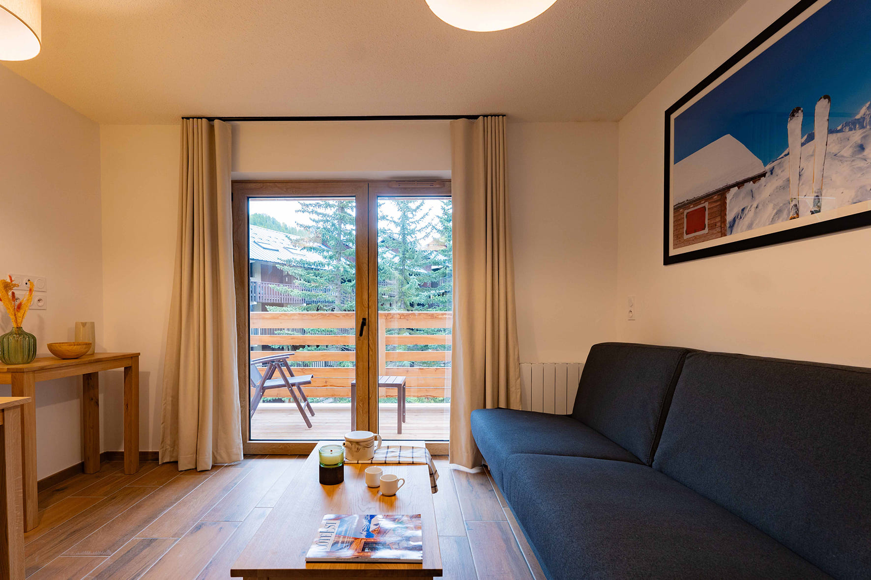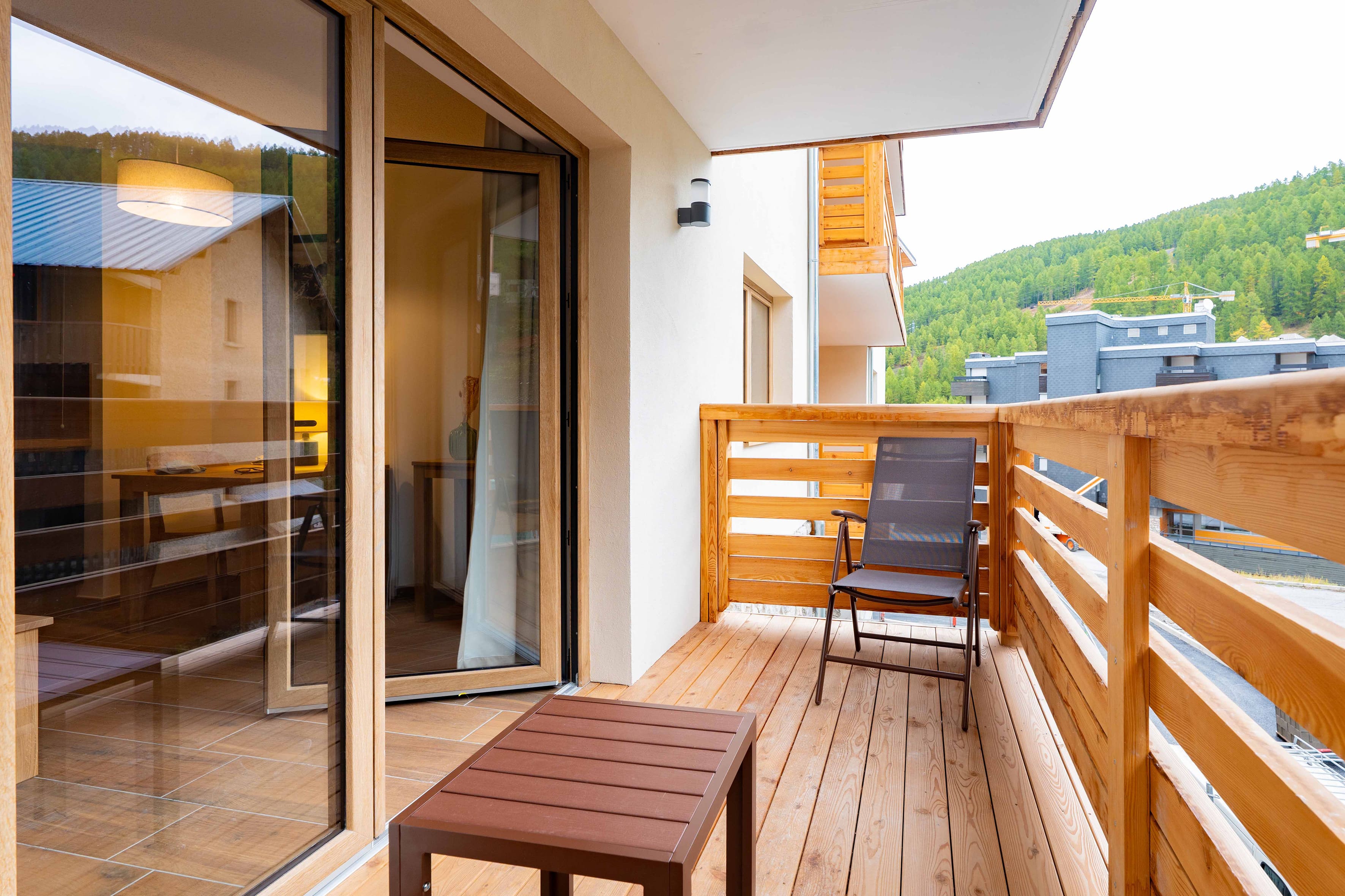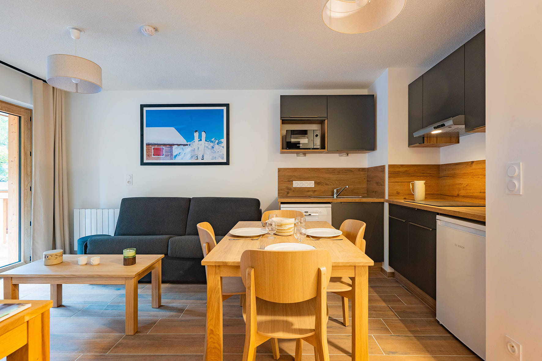 42 m² - 1 spálňa s manželskou posteľou či 2 samostatnými lôžkami, 1 spálňa s 2 samostatnými lôžkami či poschodovou posteľou, obývacia izba s kuchynským kútom a rozkladacím gaučom pre 2 osoby (možný i typ "zásuvka"), 2x sociálne zariadenie, balkón