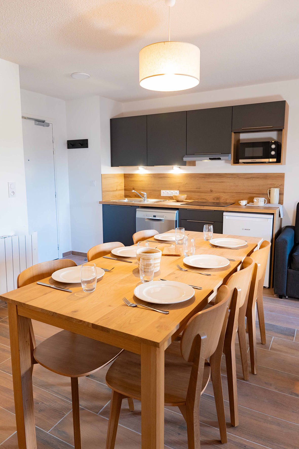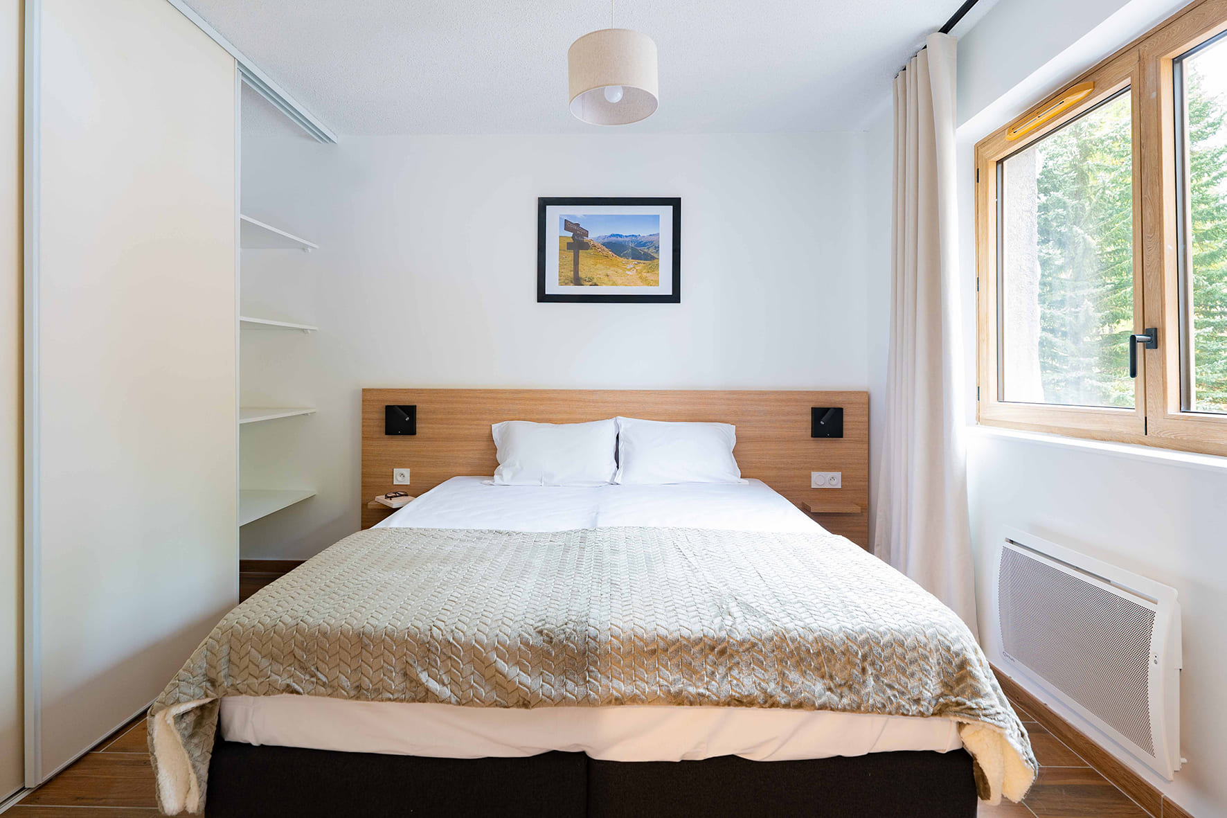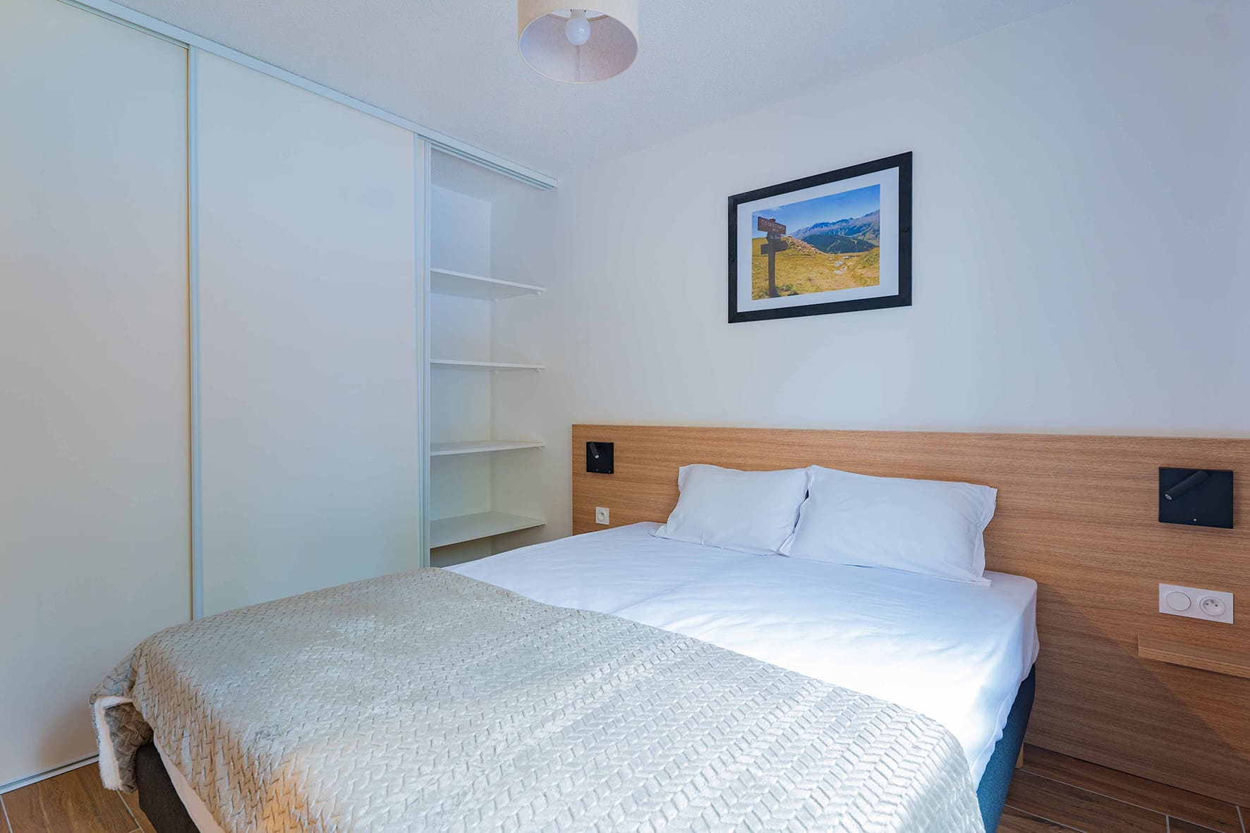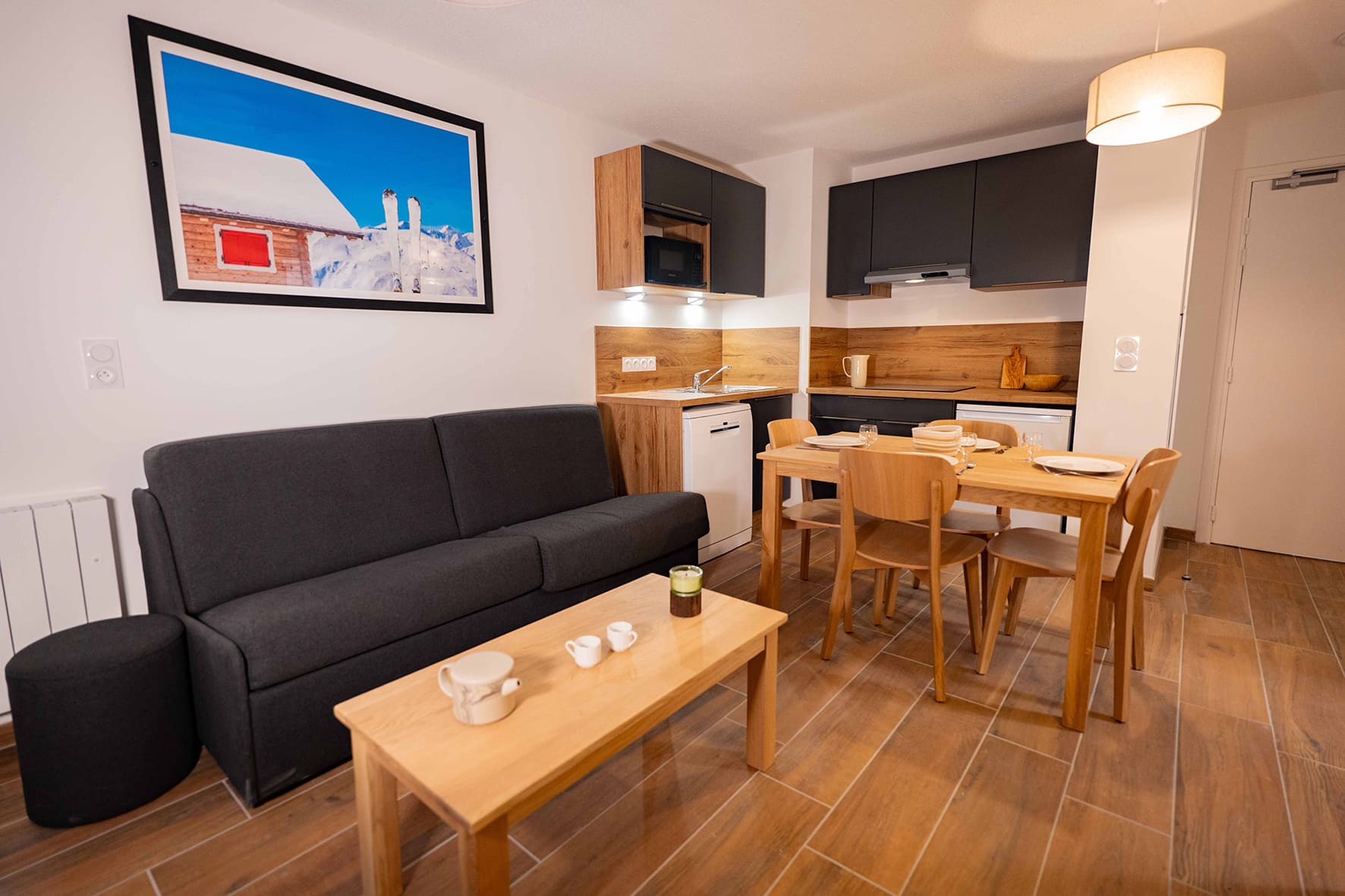 42 m² - 1 spálňa s manželskou posteľou či 2 samostatnými lôžkami, 1 spálňa s 2 samostatnými lôžkami či poschodovou posteľou, obývacia izba s kuchynským kútom a rozkladacím gaučom pre 2 osoby (možný i typ "zásuvka"), 2x sociálne zariadenie, balkón