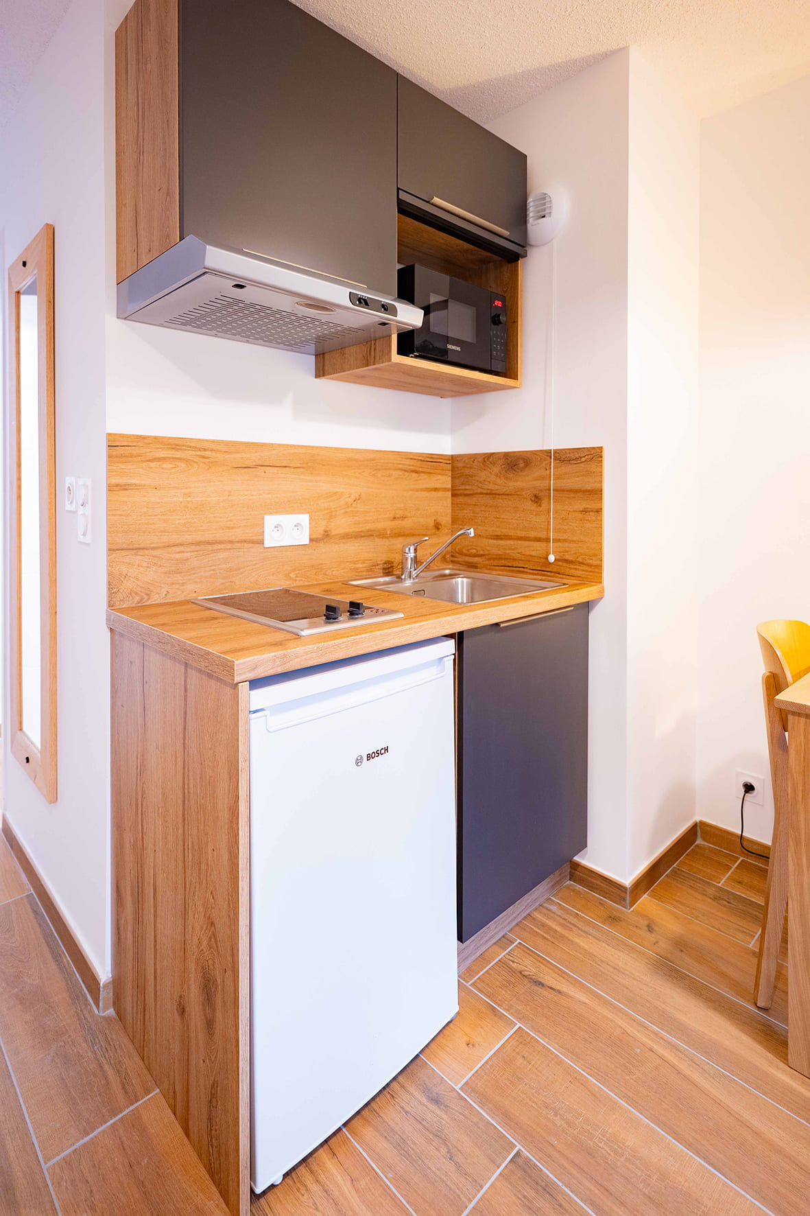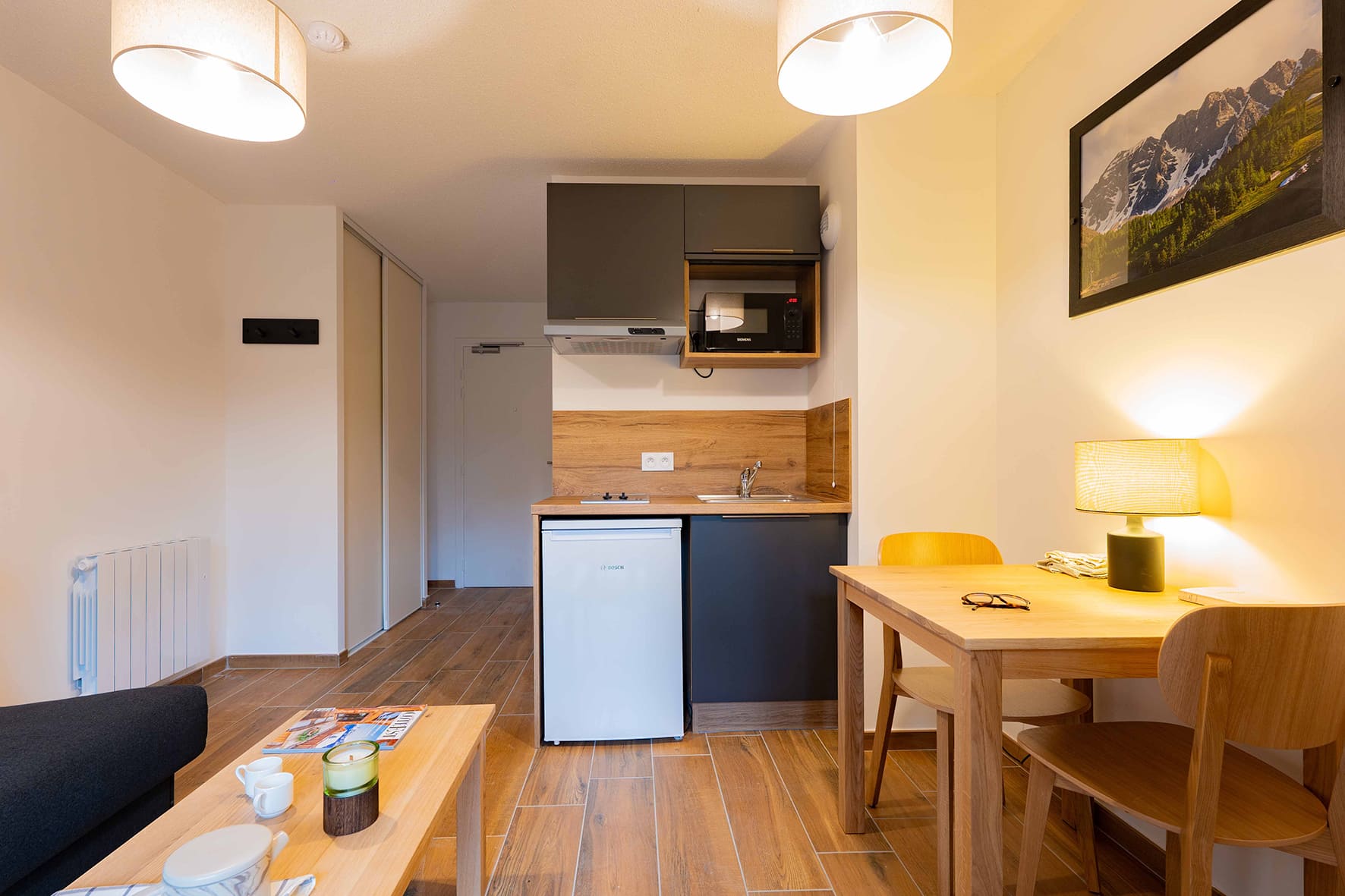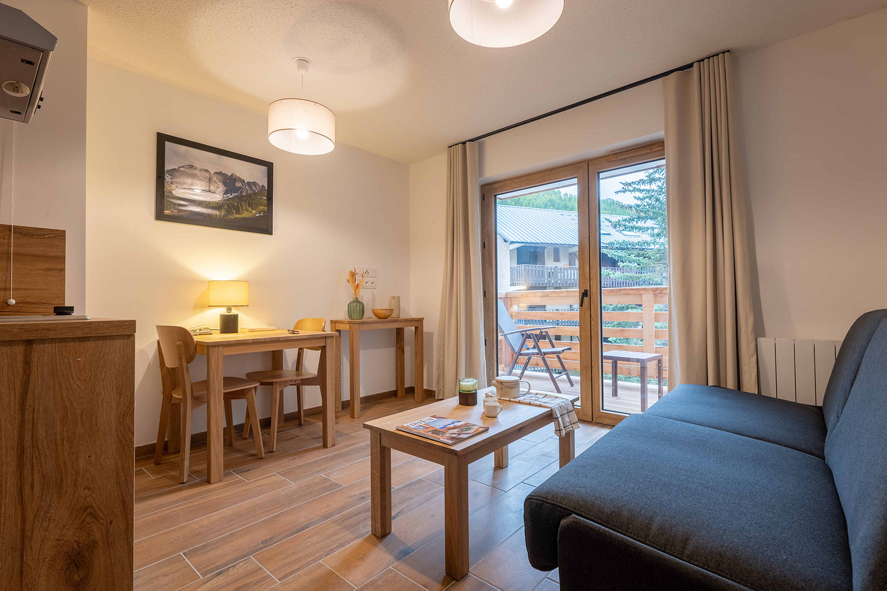 20 m² obývacia izba s kuchynským kútom a rozkladacím gaučom pre 2 osoby (možný i typ „zásuvka“), sociálne zariadenie, balkón