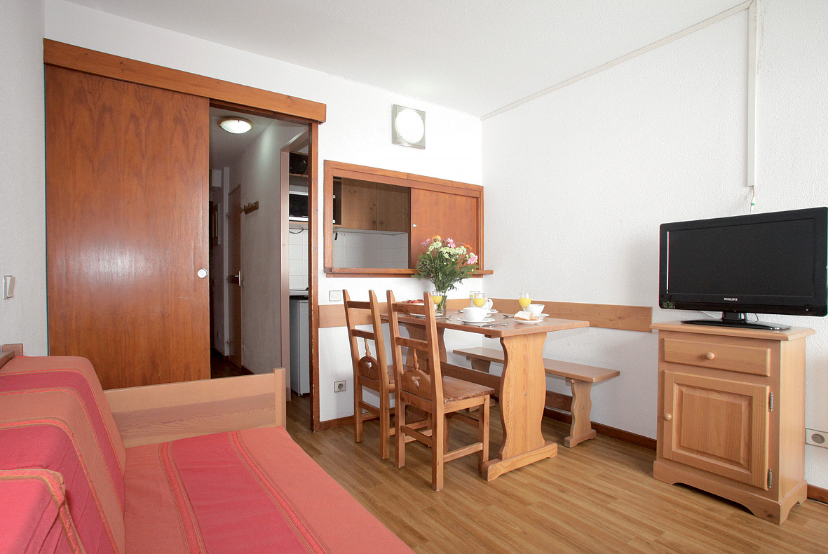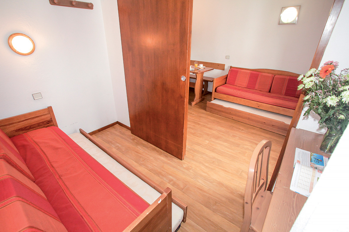 studio 4 typ A - 18 m² - obývacia izba s kuchynským kútom a rozkladacím gaučom pre 2 osoby (možný aj typ "zásuvka"), vstupná miestnosť s 2 vyklápacími lôžkami, sociálne zariadenie s vaňou, spravidla balkón