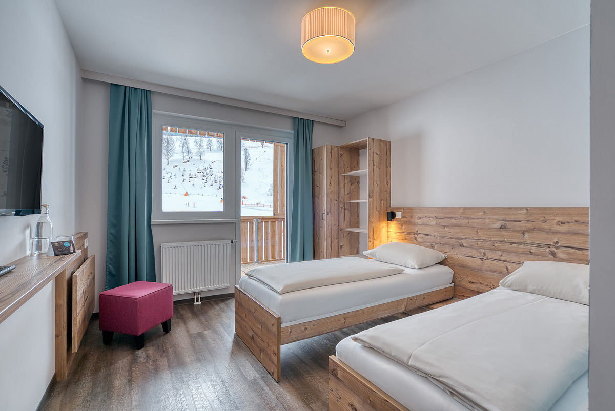 Thermenblick 2/3 - 24 m² - izba s manželskou posteľou s oddeliteľnými lôžkami, možnosť 3. lôžka formou samostatného lôžka alebo prístelky, sociálne zariadenie, oddelenbé WC, balkón s orientáciou na mestečko a rímske termálne kúpele; infant nad maximálnu obsadenosť izby nie je povolený!