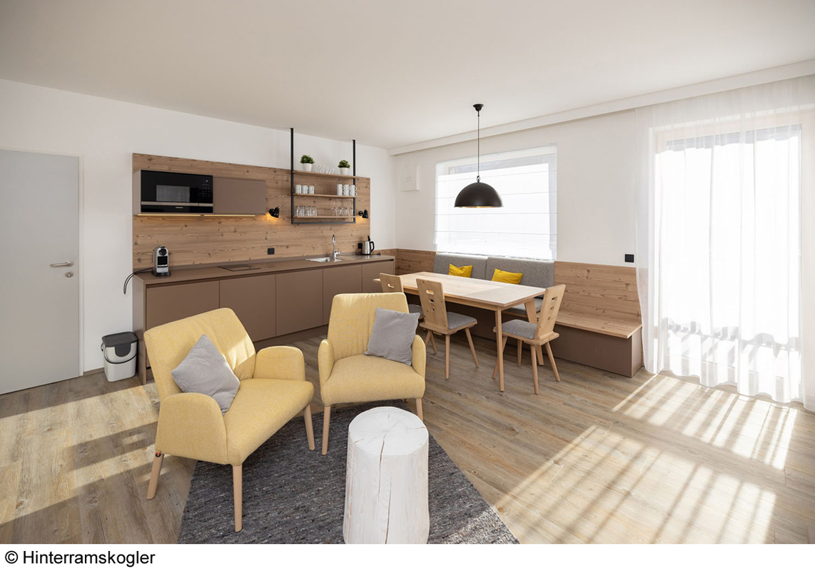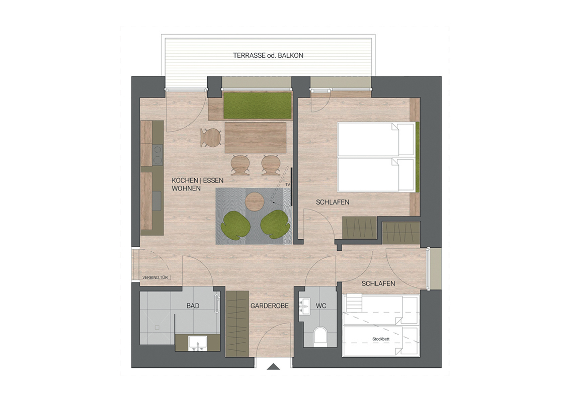 quadrilo 6/7 Classic - 61 m² - 1 spálňa s manželskou posteľou a prípadne prísteľkou pre 1 osobu, spálňa s poschodovou posteľou pre 2 osoby, ďalšia spálňa s 2 samotstanými lôžkami, obývacia izba s kuchynským kútom, sociálne zariadenie, oddelené WC, balkón; infant nad rámec maximálnej obsadenosti apartmánu nie je povolený!