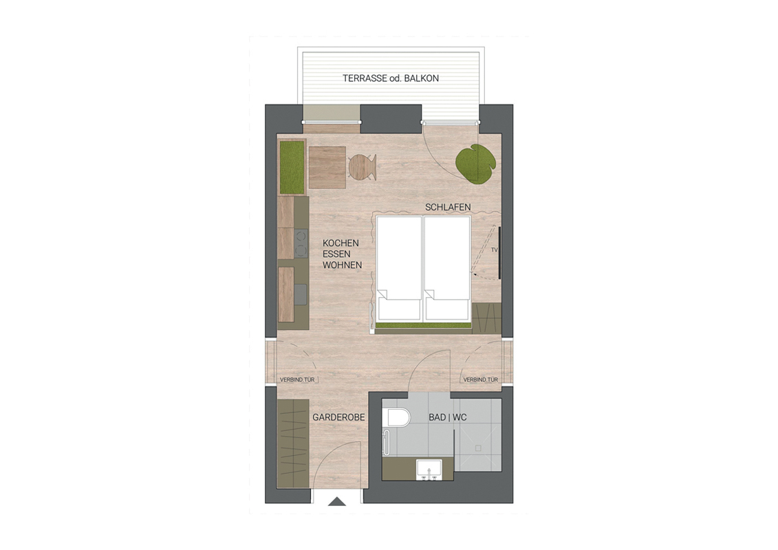 mono 2 - 28 m² - obývacia izba s kuchyňským kútom a manželskou posteľou, sociálne zariadenie, balkón či terasa; infant nad rámec maximálnej obsadenosti apartmánu nie je povolený!