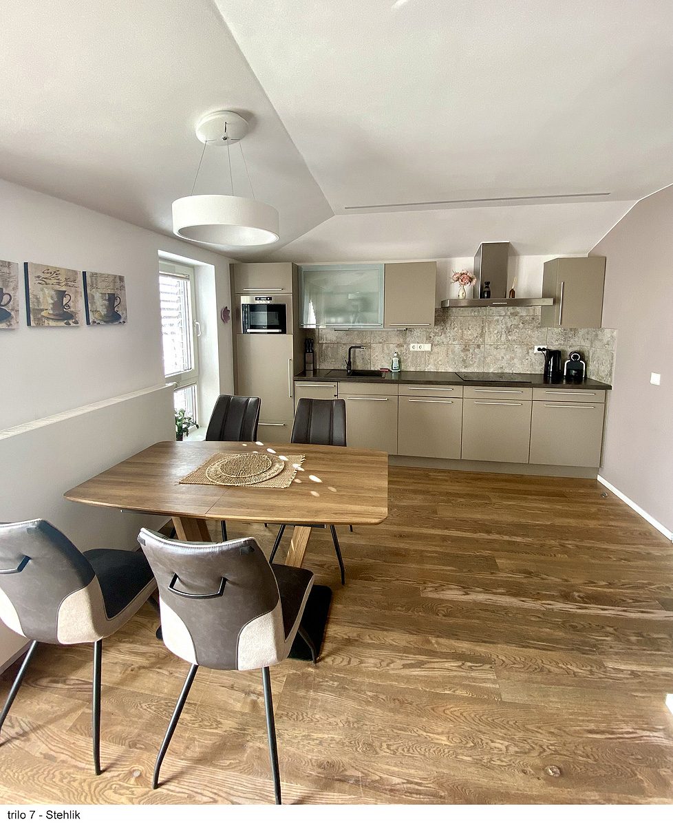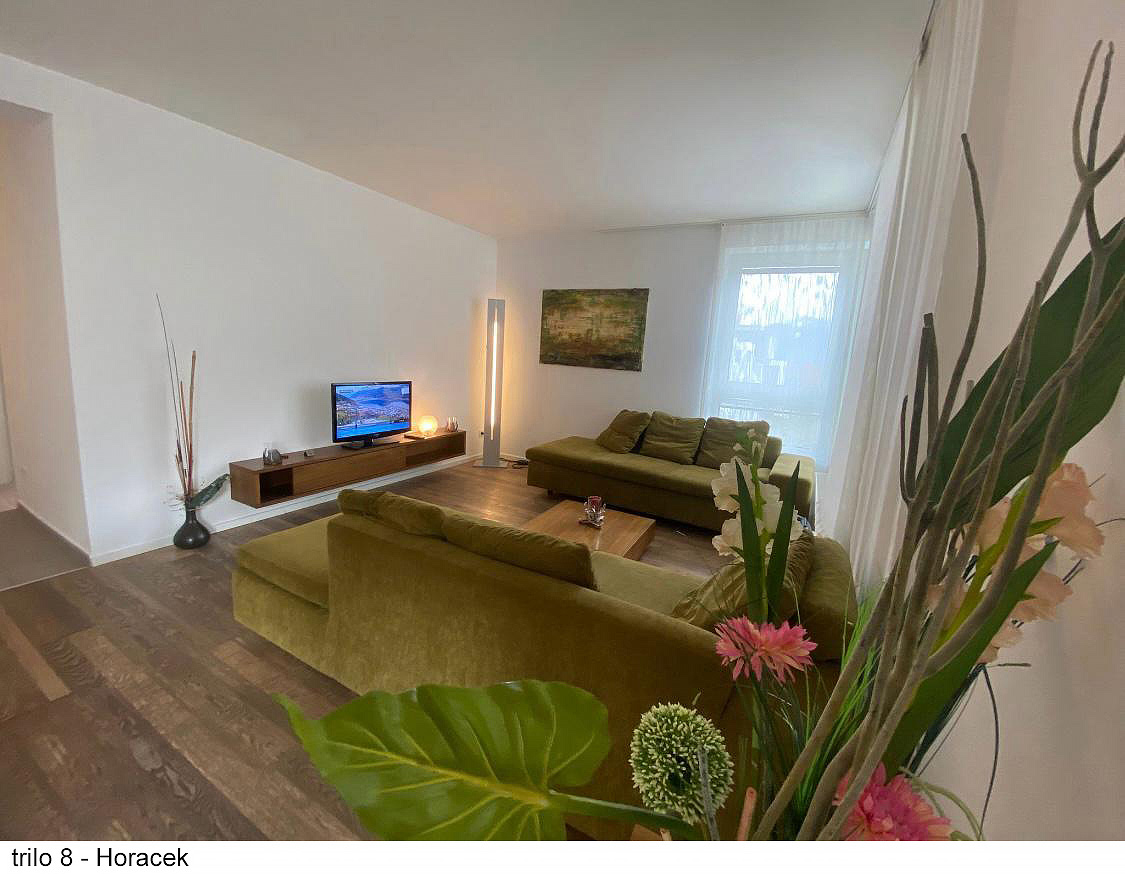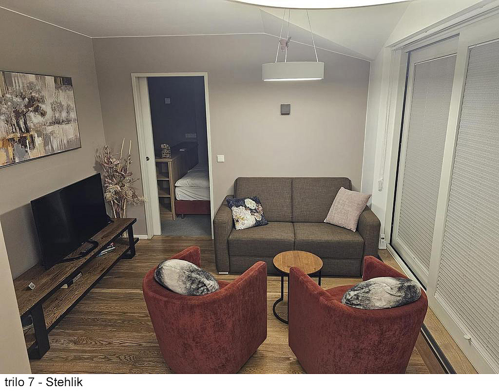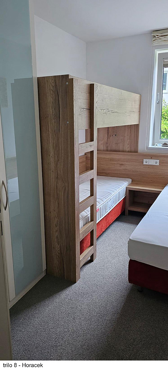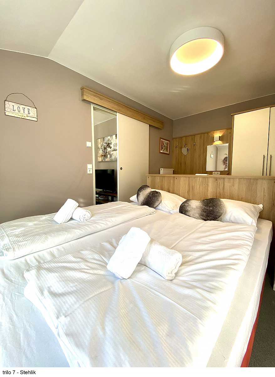 trilo 7 - 1 spálňa s manželskou posteľou, 1 spálňa s atypickou poschodovou posteľou pre 2 osoby a možnosťou prístelky pre 1 osobu, obývacia izba s kuchynským kútom a rozkladacím gaučom pre 2 osoby, 2x sociálne zariadenie, balkón
