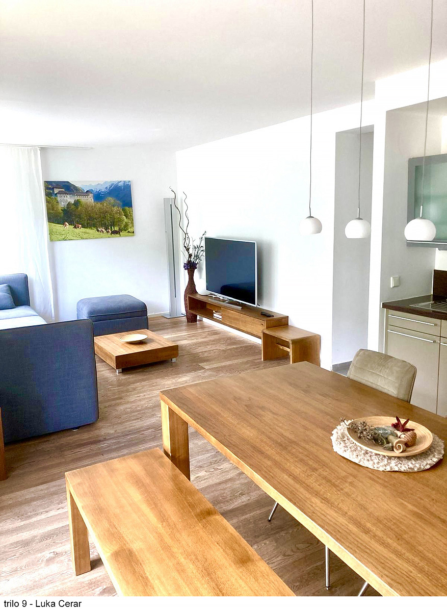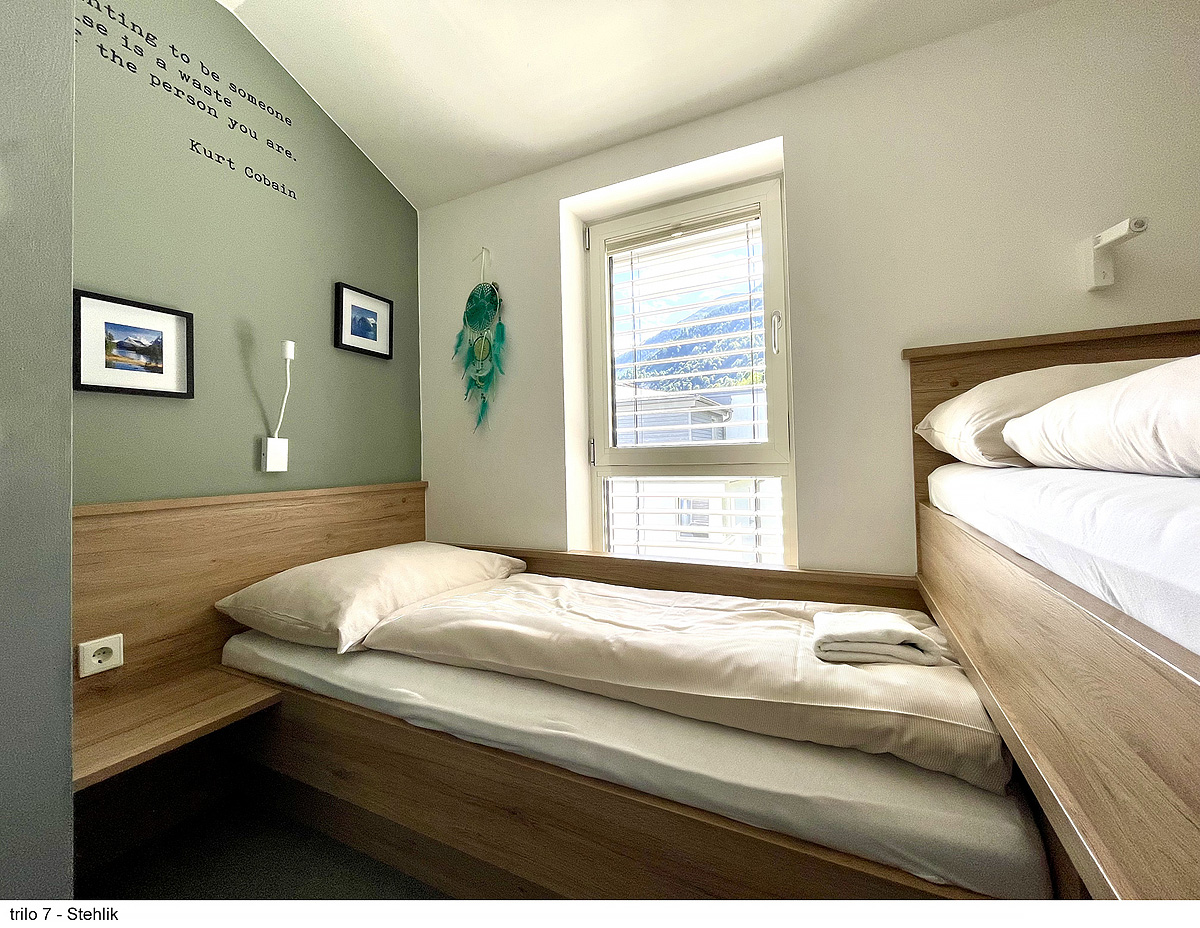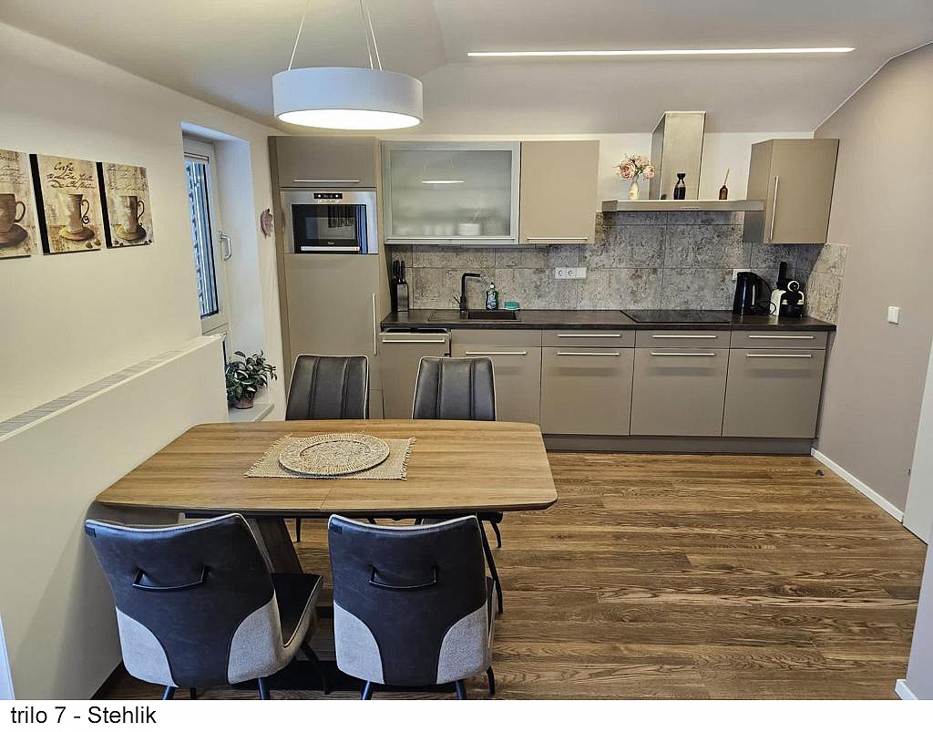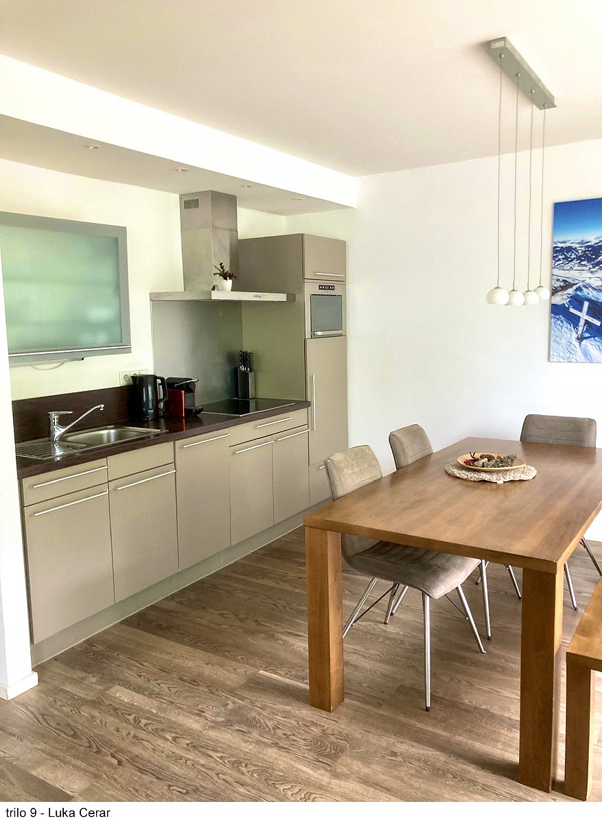 trilo 7 - 1 spálňa s manželskou posteľou, 1 spálňa s atypickou poschodovou posteľou pre 2 osoby a možnosťou prístelky pre 1 osobu, obývacia izba s kuchynským kútom a rozkladacím gaučom pre 2 osoby, 2x sociálne zariadenie, balkón