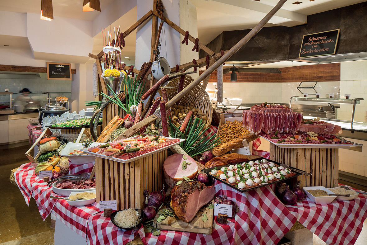 večera - formou bohatého tematického bufetu studených a teplých predjedál, hlavných jedál s prílohou, šalátov, syrov a dezertov; od 10:00 do 22:00 hodín vybrané nealkoholické nápoje, čapované pivo a stolové víno, miešané koktaily a vybrané liehoviny k dispozícii len na hlavnom bare, čapované pivo, stolové víno a nealko, potom i pri obede a večeri v hlavnej reštaurácii, ostatné nápoje za poplatok, detský bufet