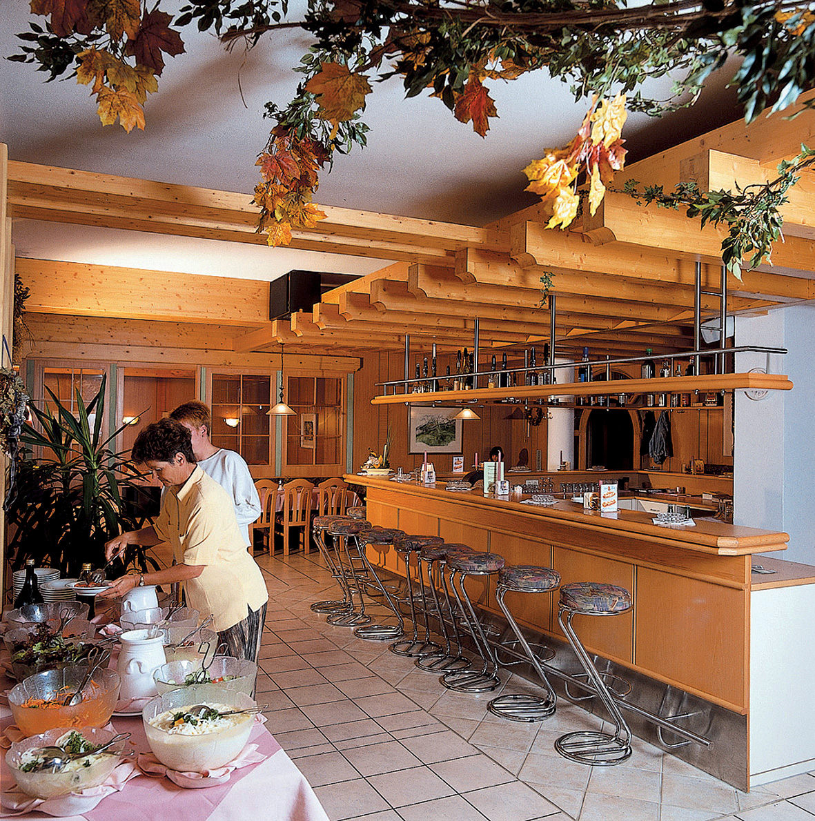 formou servírovaného 3chodového menu s výberom z hlavného jedla s prílohou, spravidla servírované studené alebo teplé predjedlo či polievka, servírovaný šalát alebo dezert, nápoje za poplatok; tématické večery spravidla fotmou bufetu
