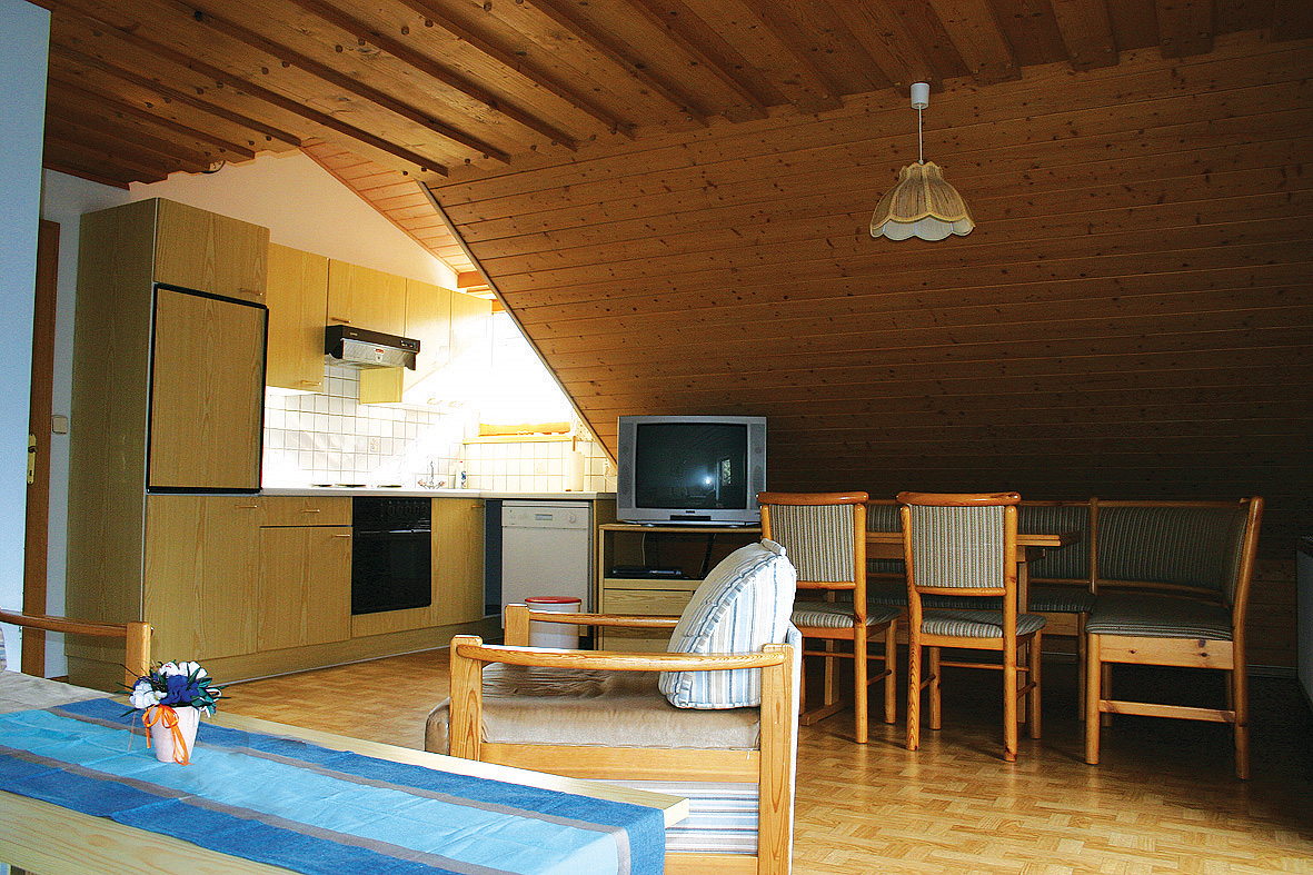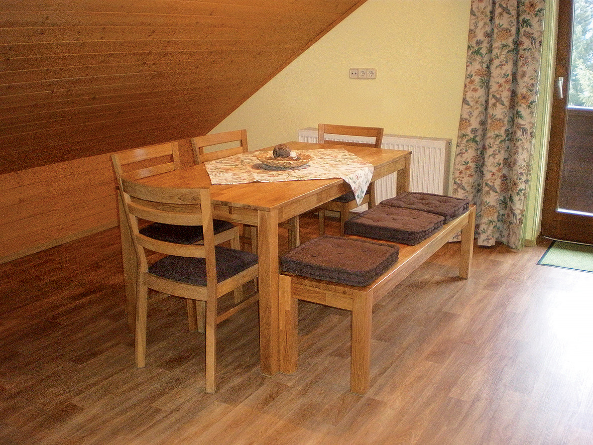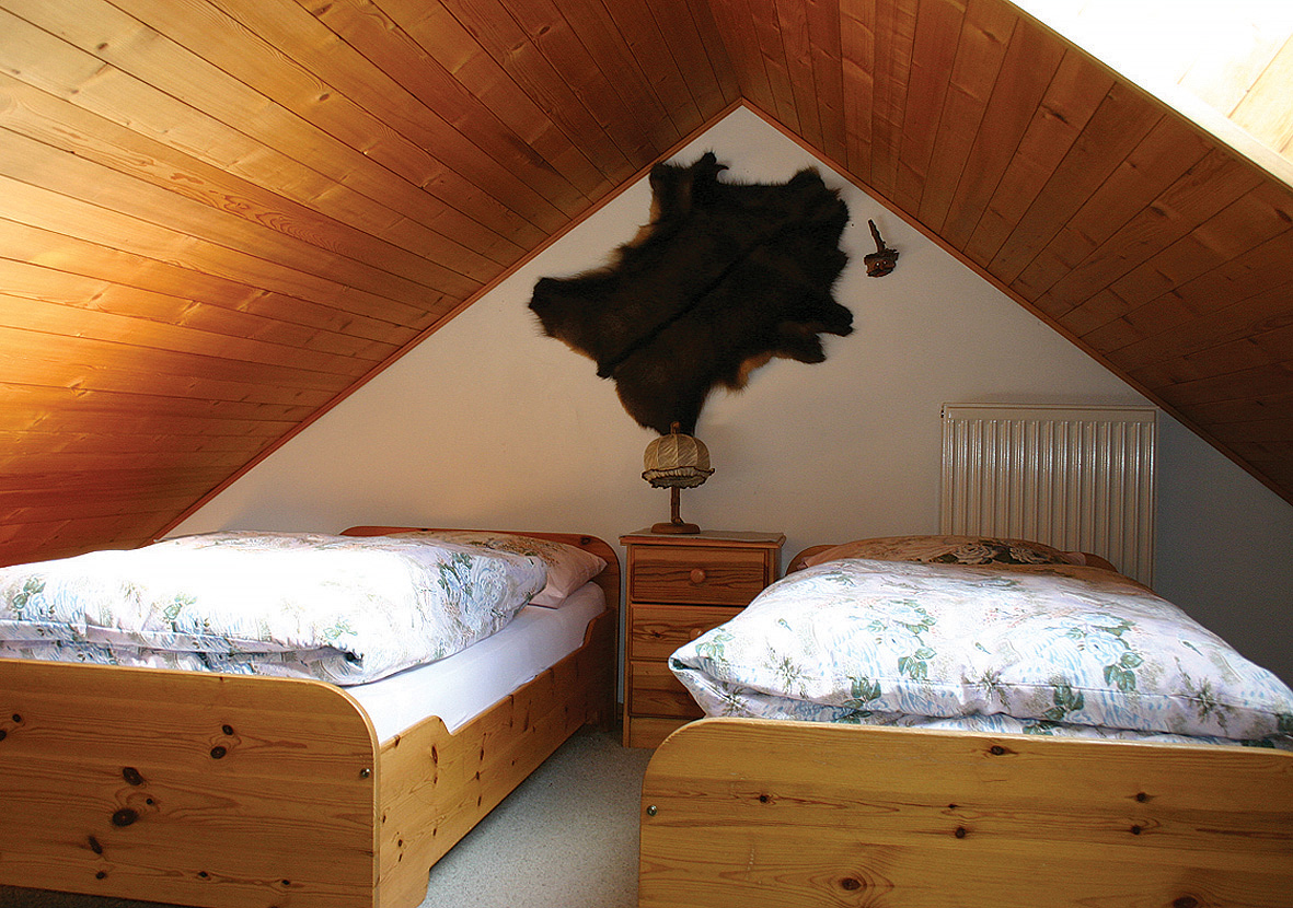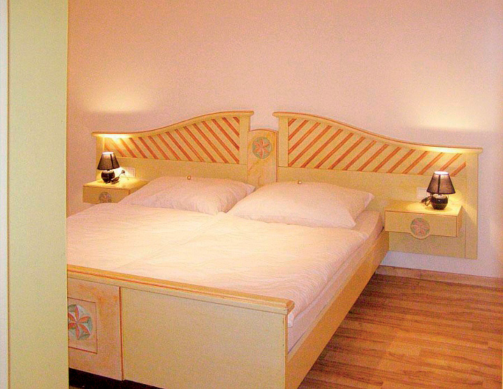 trilo 6 typ A - 65 až 70 m² - 1 spálňa s manželskou posteľou, 1 spálňa spravidla s 2 samostatnými lôžkami (spálňa je situovaná do veľmi nízkeho mazonetového podkrovia; prístup po strmých schodoch), obývacia izba s kuchynským kútom a 2 gaučami pre 1 osobu, sociálne zariadenie, balkón