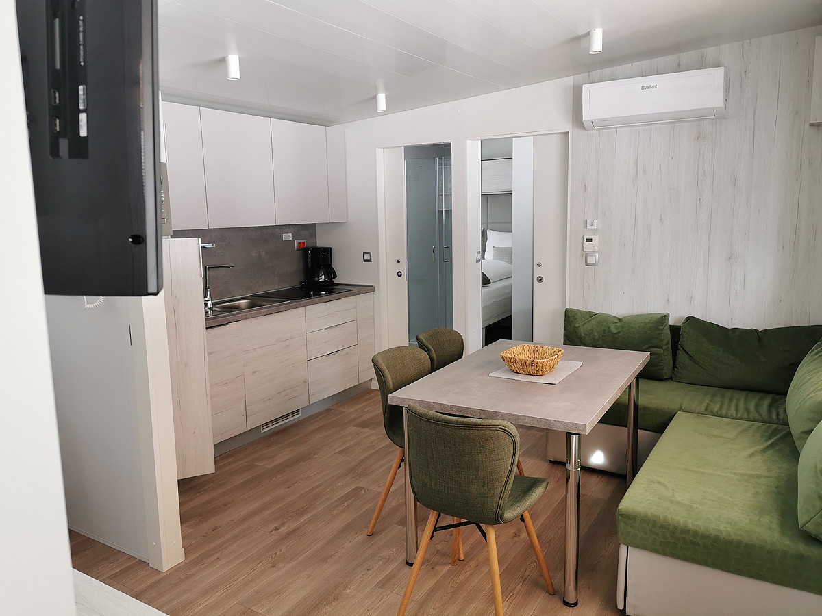 40 m² - spálňa s manželskou posteľou, spálňa s 2 samostatnými lôžkami, obývacia izba s kuchynským kútom, predsieň, sociálne zariadenie, oddelené WC, terasa